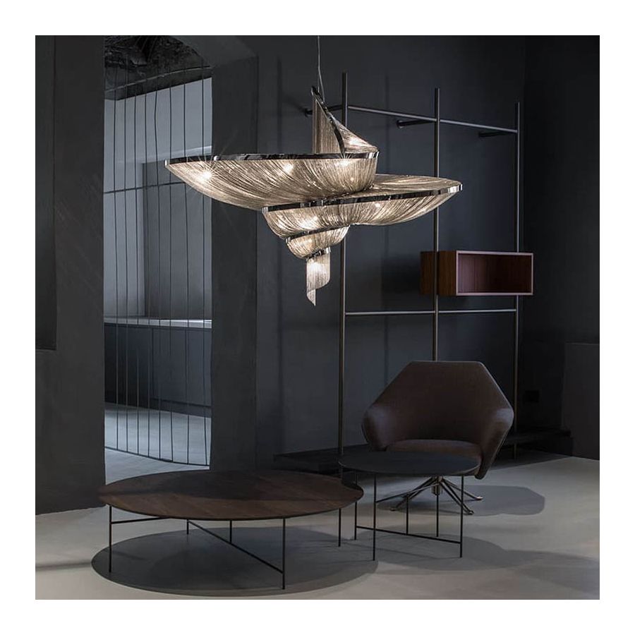 Epoque är en ljusskulptur utformad för att studera ljus- och skuggspel Ø11.8’’ och volymer. Resultatet är ett modernt uttryck för dessa tekniker från renässansen i en fantastisk ljuskrona. Bestående av böjda, organiska linjer är Epoque:s ram gjord av flexibelt och hållbart mässingsmaterial, upphängd i kedjor av nickel. Två metallband, en central förlängd sektion och ett yttre band av vida bågar, låter ljuset omsluta ett rum i reflektioner av mjukt ljus. Epoque har väckt uppmärksamhet hos personer i designkretsar med förfinad smak. Epoque finns i nickel, svart nickel och guldfinish.