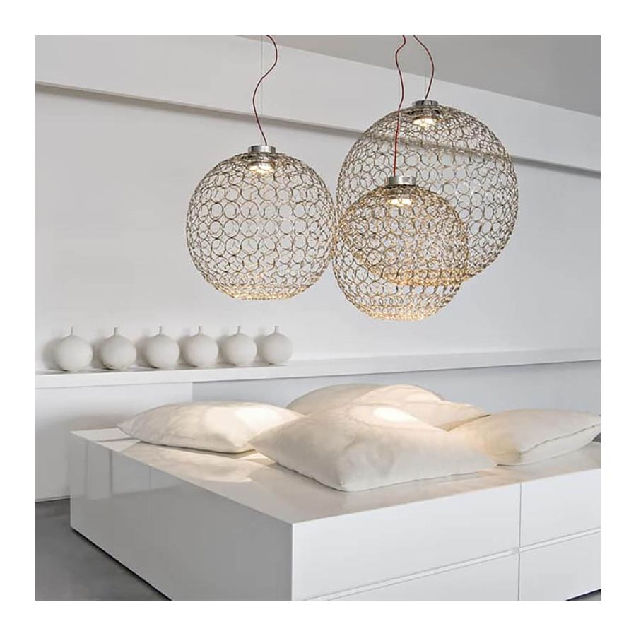 Denna rena, precisa form är resultatet av många timmars arbete från våra hantverkare, som noggrant svetsar varje ring tillsammans. G.r.a. är en ömtålig, förfinad pendel vars intrikata form döljer dess romantiska sken. Finns som oval eller sfär, och med ytbehandling i nickel eller guld fungerar G.r.a. som ett elegant, diskret komplement till vilket rum som helst.