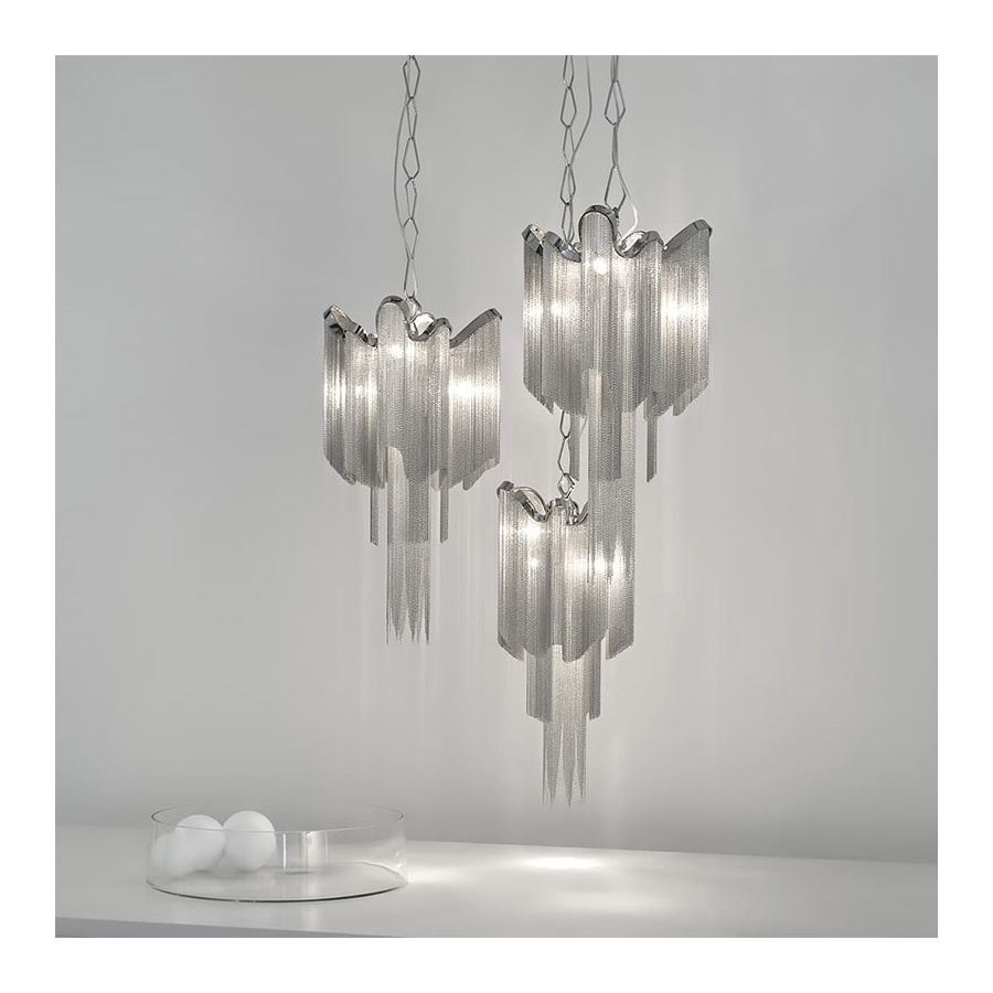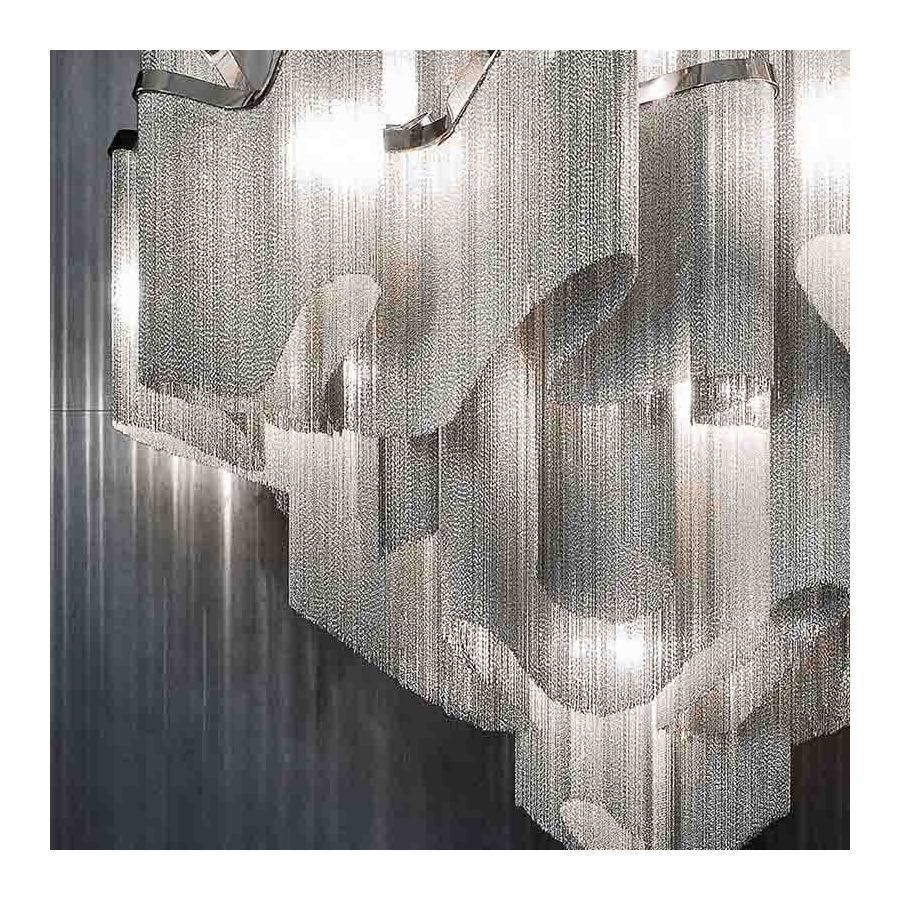 En fantastisk design av Christian Lava, Stream är en imponerande närvaro i vilket rum som helst. Streams design utnyttjar de fysiska egenskaperna hos de använda materialen för att omsluta ett rum i ett unikt, uppslukande ljus. Här verkar över 7 kilometers metallkedja flyta ner från den vågiga, nickelpläterade ramen. Dessa kaskaderande nivåer kastar en strimmig, men lugn, skugga genom rummet.