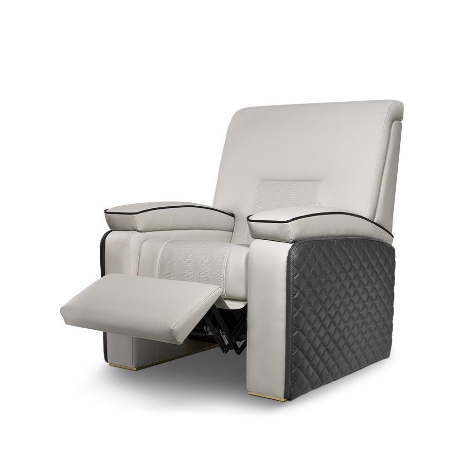 The Thomson Massage Chair offers the comfort and luxe feel of its collection, along with a feature that makes this upholstery solution the ultimate embodiment of relaxation. With a massage system, and premium materials such as polished brass, grey synthetic leather, and Nata synthetic leather, this design piece will upgrade any home theater or living room with its refreshing details.