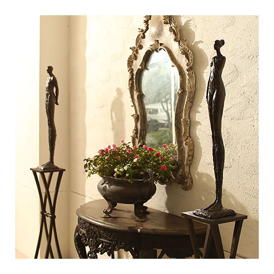 The tall sculpture Female Reveal II by Tom Corbin is made of bronze.