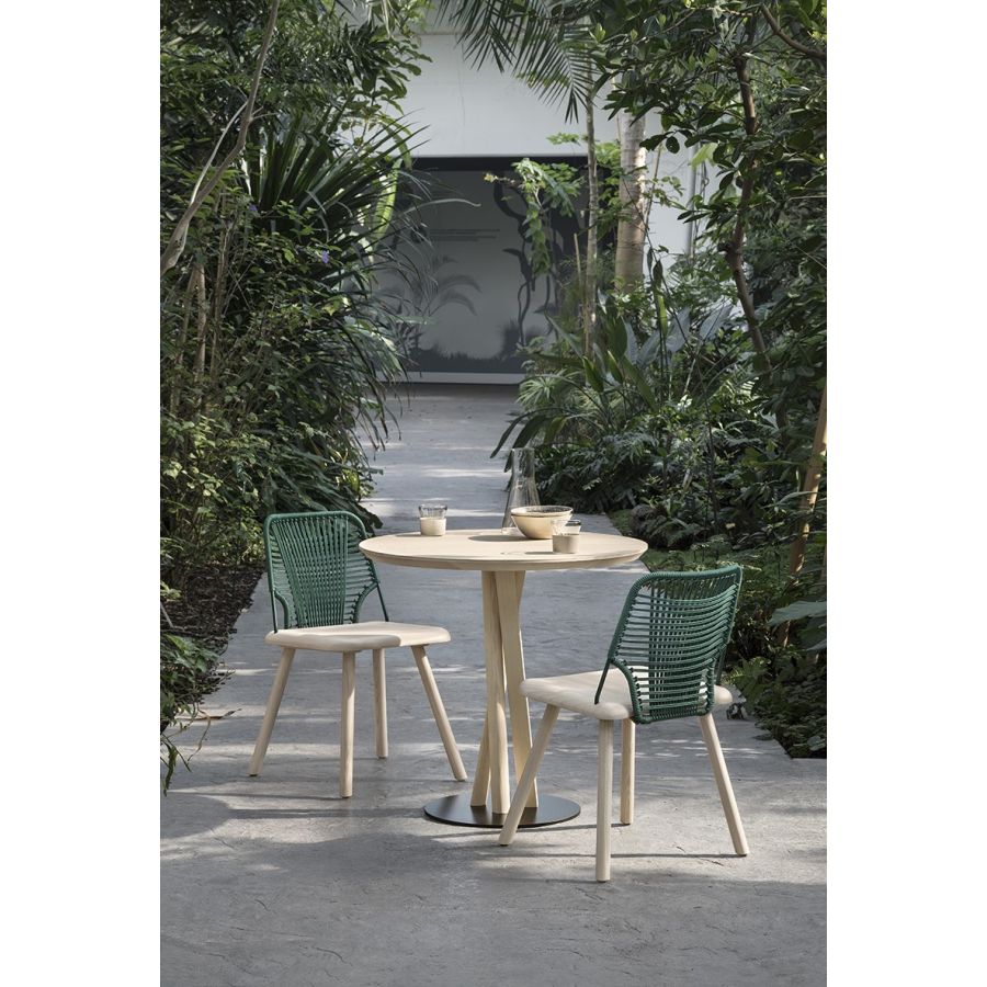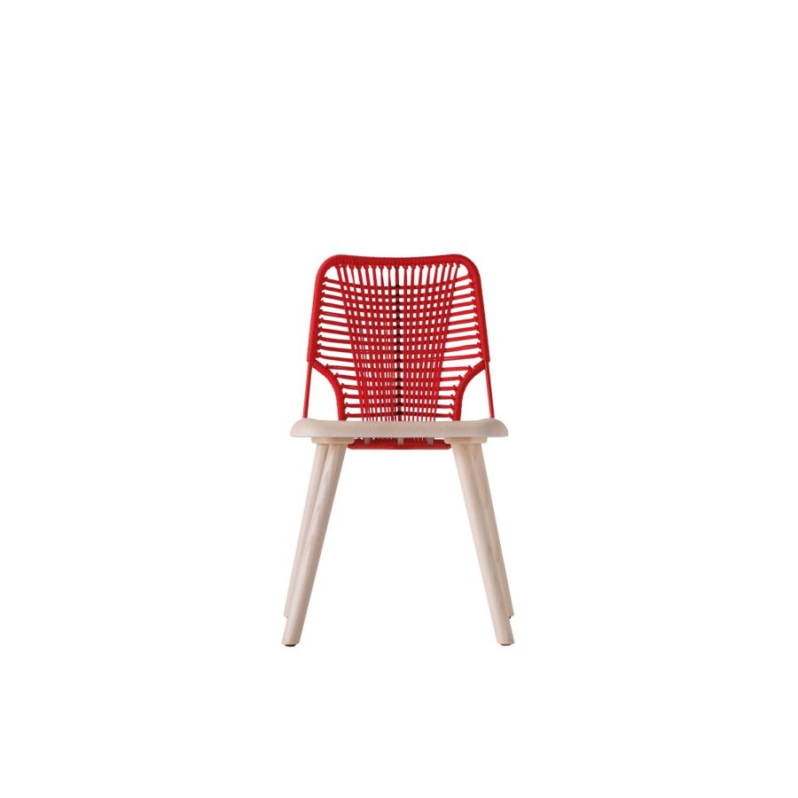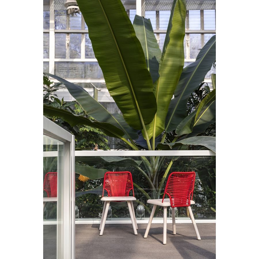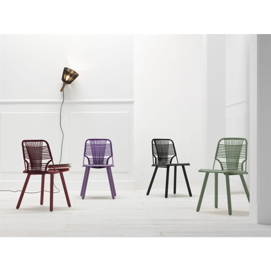 Hybridisation is the concept on which the Jackie collection is based. Designed by Emilio Nanni, it is a chair in which the stable solid wood frame meets an inviting metal rod backrest covered in a woven rope design.