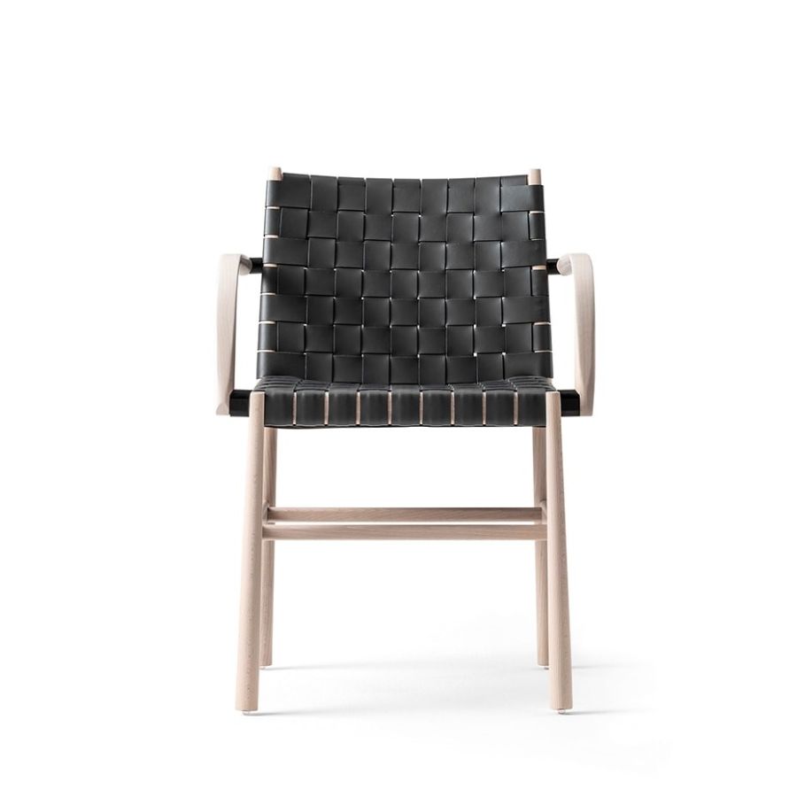 This year Julie is joined by the version with armrests, boosting its comfort level and enhancing a collection that encompasses the all-beechwood design with seat in visible plywood, or with padded seat upholstered in fabric, velvet, eco-leather and natural leather. Leather braids in the seat and backrest, or in rope only for the backrest, are the variants that stress the purity of the shapes and the empty and full effects, creating chairs and stools that are both versatile and welcoming.