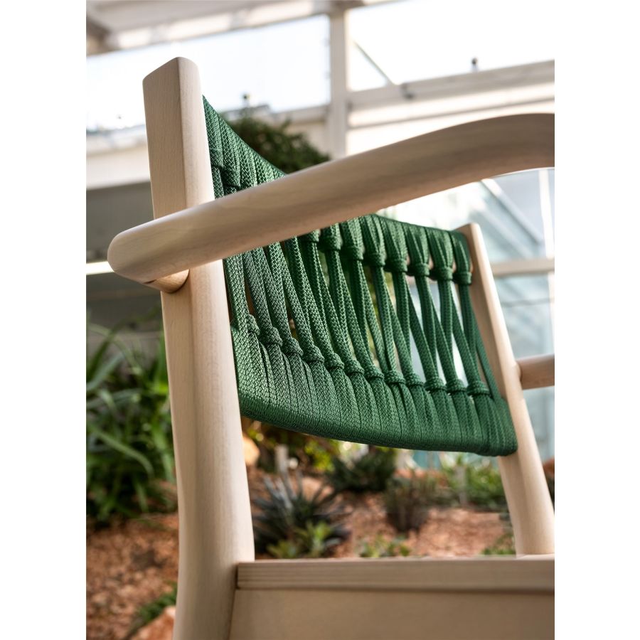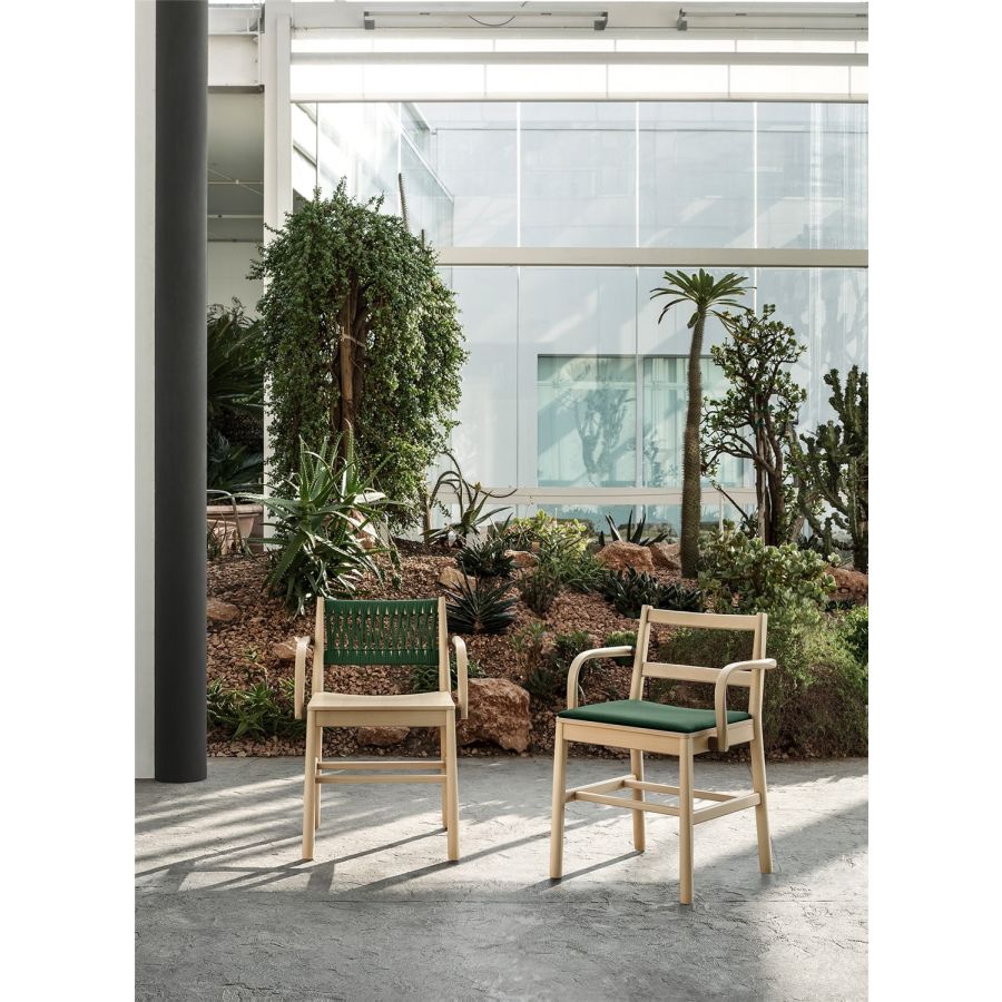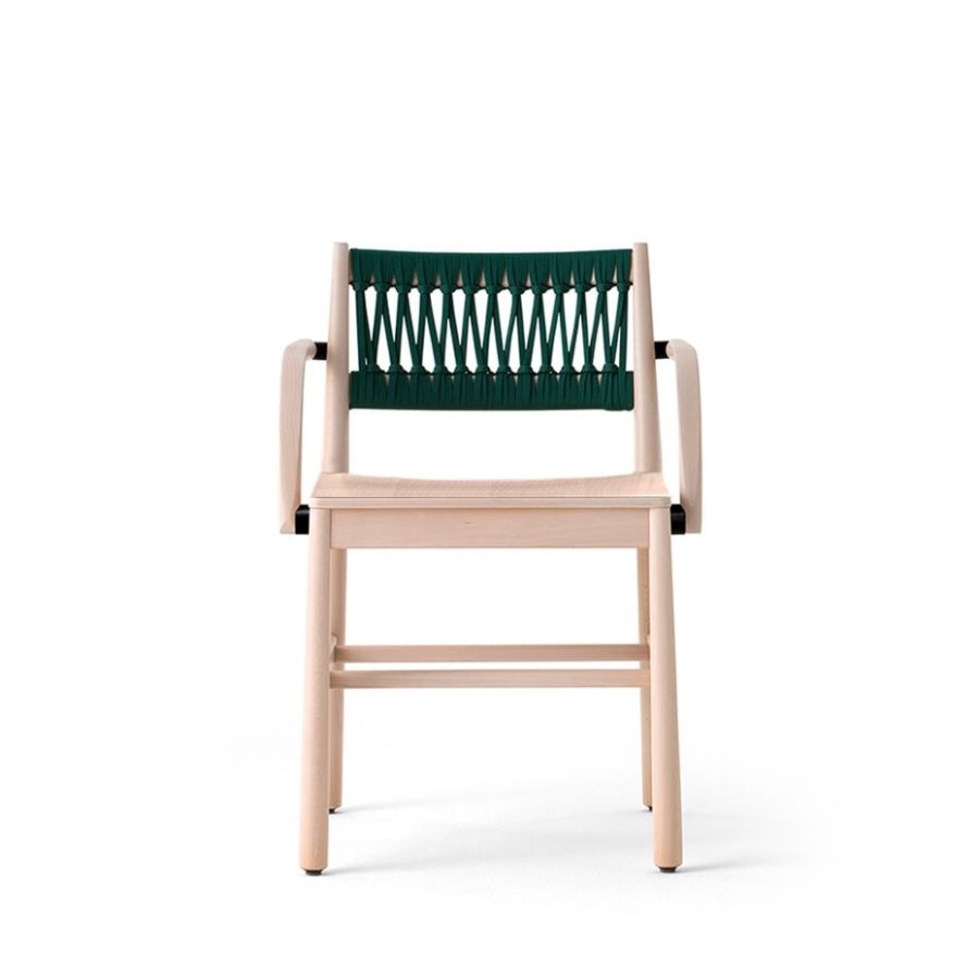 This year Julie is joined by the version with armrests, boosting its comfort level and enhancing a collection that encompasses the all-beechwood design with seat in visible plywood, or with padded seat upholstered in fabric, velvet, eco-leather and natural leather. Leather braids in the seat and backrest, or in rope only for the backrest, are the variants that stress the purity of the shapes and the empty and full effects, creating chairs and stools that are both versatile and welcoming.