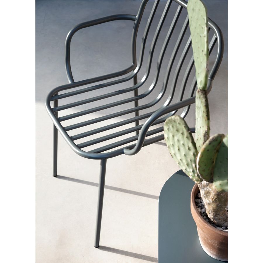 A collection made entirely of metal, with minimalist design and maximum functionality. The backrest and seat of Metis Line feature a wire design with vertical ovals, which sinuously and harmoniously accompany the outline of the frame, adapting to the bodyto ensure comfort. The chair with or without armrests, the lounge version with or without armrests and the stool in two heights bring ergonomic forms and an infinity of colour options to any indoor or outdoor space.