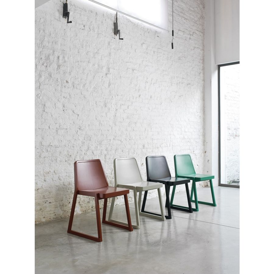 The frame, seat and backrest are in beech, either bleached, natural or lacquered in a very wide range of shades. The seat and backrest are padded and upholstered in fabric, velvet, leather, faux leather, or flame retardant Trevira textiles.