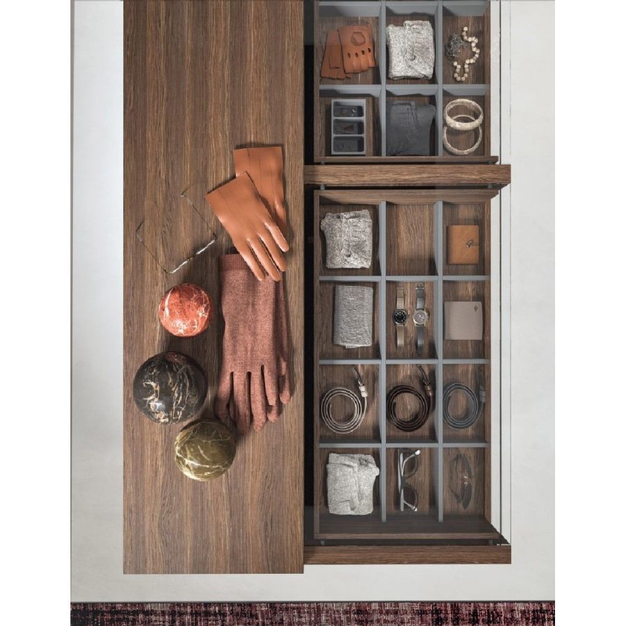 from drawers to open unit and pull-out shelves. The various tops, in wood or glass, guarantee tidiness and elegance.