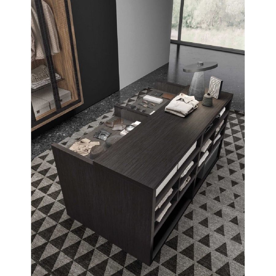 Practical containment solution, the island unit is located in the center of the room and equipped with various elements: