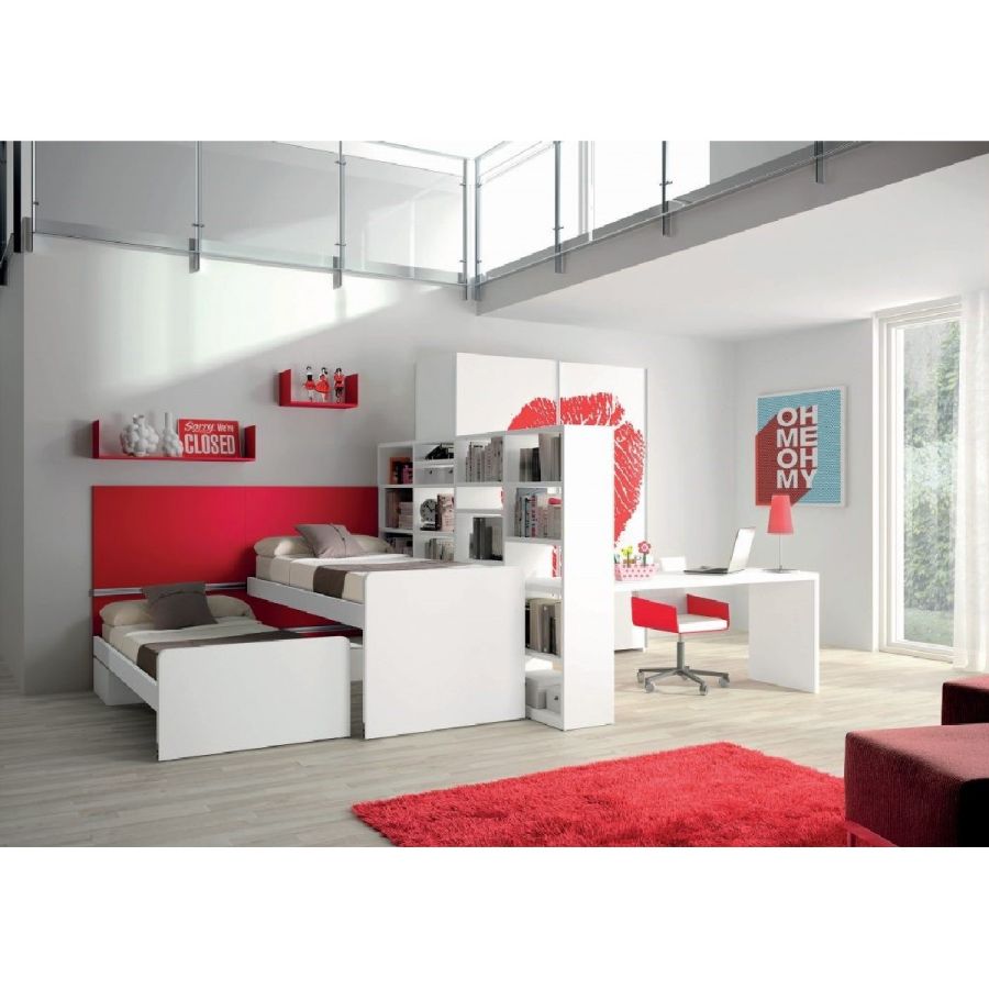 Beds and independently sliding writing-desks in order to make cleaning, making bed and the use of desk easier.