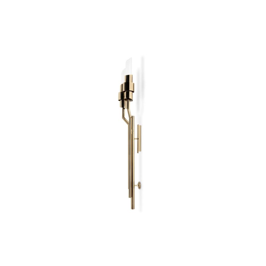 The Tycho Torch Small Wall Lamp brings refined elegance to a compact form, making it an ideal lighting accent for intimate spaces. Featuring ribbed crystal glass tubes and a gold-plated brass structure, it adds a subtle glow of sophistication to both contemporary and classic interiors. Perfect for residential or hospitality projects, this timeless piece enhances the atmosphere with warmth, charm, and architectural grace.