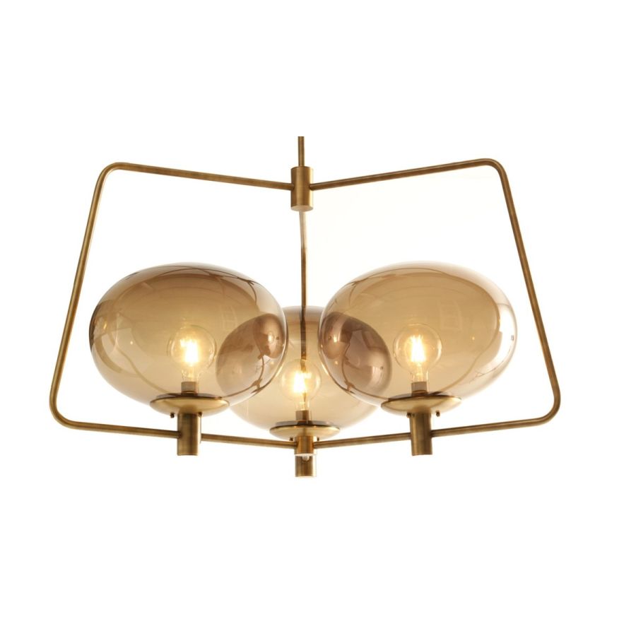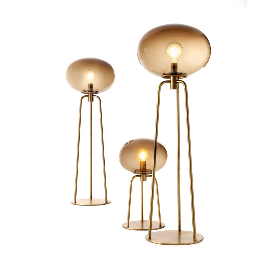 Satin brass , with lamp holder element in bronze glass. Available in different sizes and types: chandelier , floor lamp , table lamp , night table lamp.