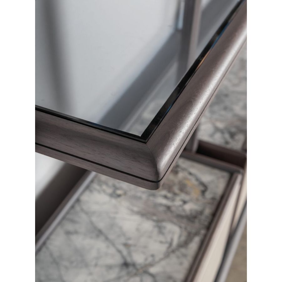 Beyond its organizational capabilities, Joker functions as an architectural element within the room—a vertical composition that draws the eye upward while maintaining an open, breathable quality through its glass shelving. The modular nature allows it to evolve alongside changing needs and collections, adapting from library to display gallery to hybrid storage with equal grace. The integration of walnut, glass, and leather creates a material conversation that elevates everyday objects placed upon it, transforming books, art, and personal treasures into a curated exhibition. It's furniture that understands the difference between merely holding things and truly showcasing them.