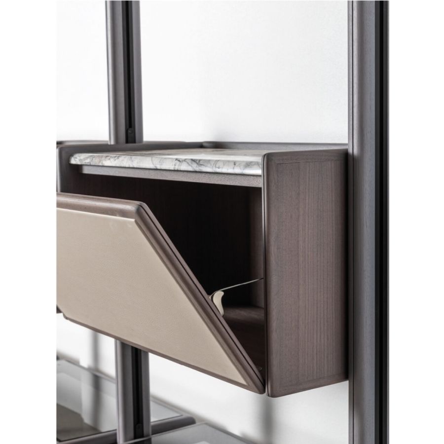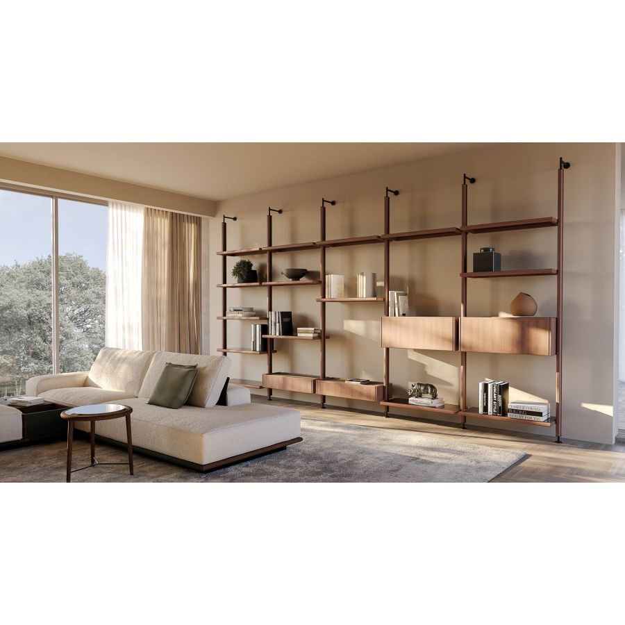 Joker is a modular bookcase with sculptural presence, designed to articulate space through rhythm and distinctive character. The vertical supports are clad in American walnut, while the drop-down storage units feature doors enriched with leather insets. The shelves—framed in solid walnut with glass centers—complete the composition with visual lightness and refined elegance. Joker represents a versatile system that unites aesthetic appeal with practical function through the authentic sophistication of Ulivi Salotti.