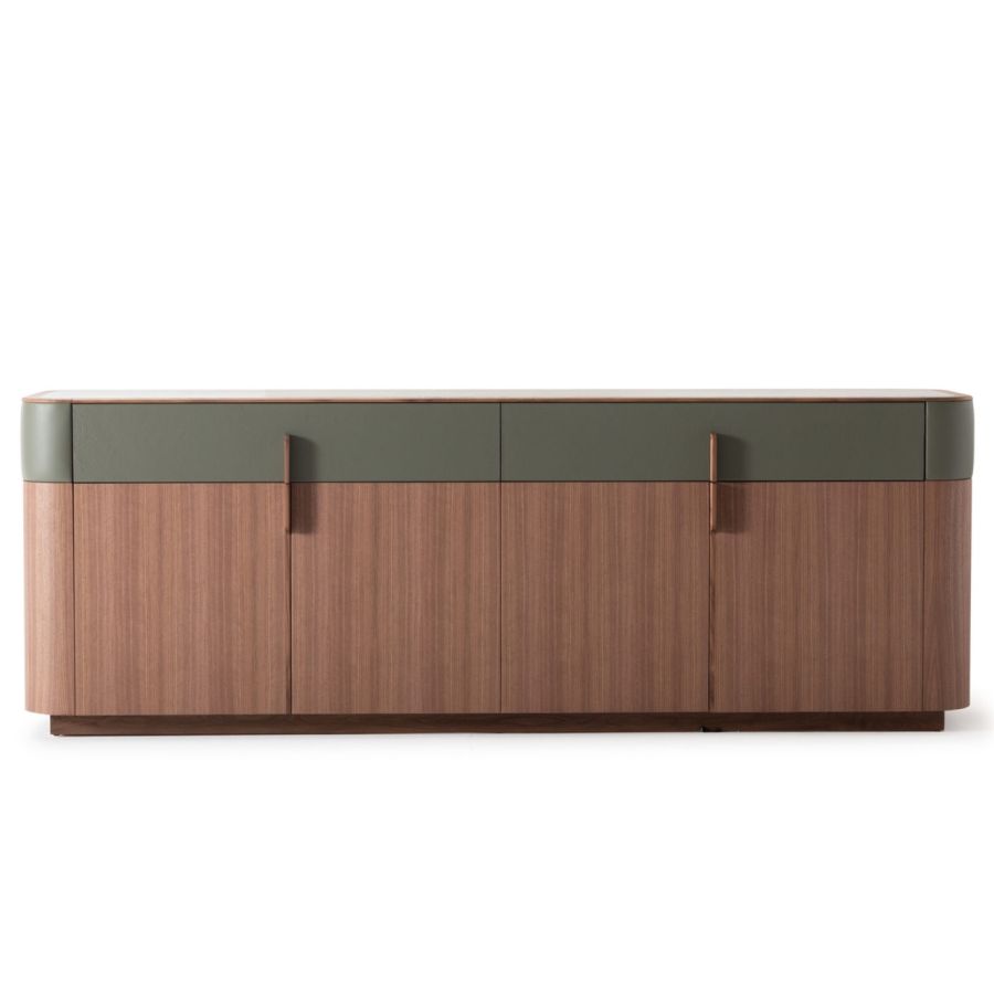 Kezia is a sideboard of distinguished character, defined by leather insets that adorn the doors and sides with tailored sophistication. The top is offered in wood or marble, enabling personalized spatial expression. The integrated handle, sculpted from solid American walnut, serves as a signature detail of authenticity and expert craftsmanship. Kezia is conceived for those who value the seamless integration of utility, beauty, and exceptional materials.
