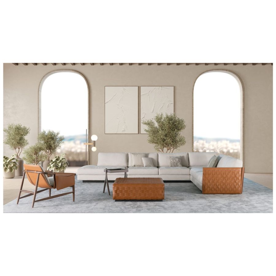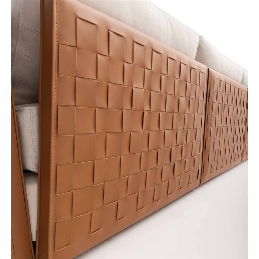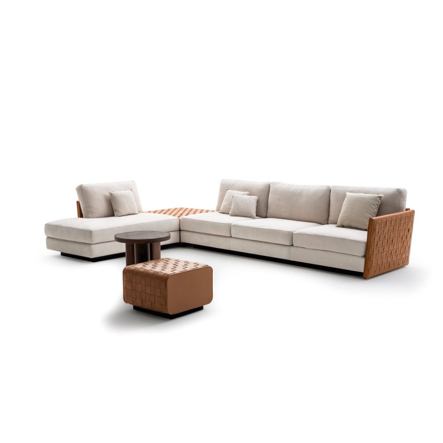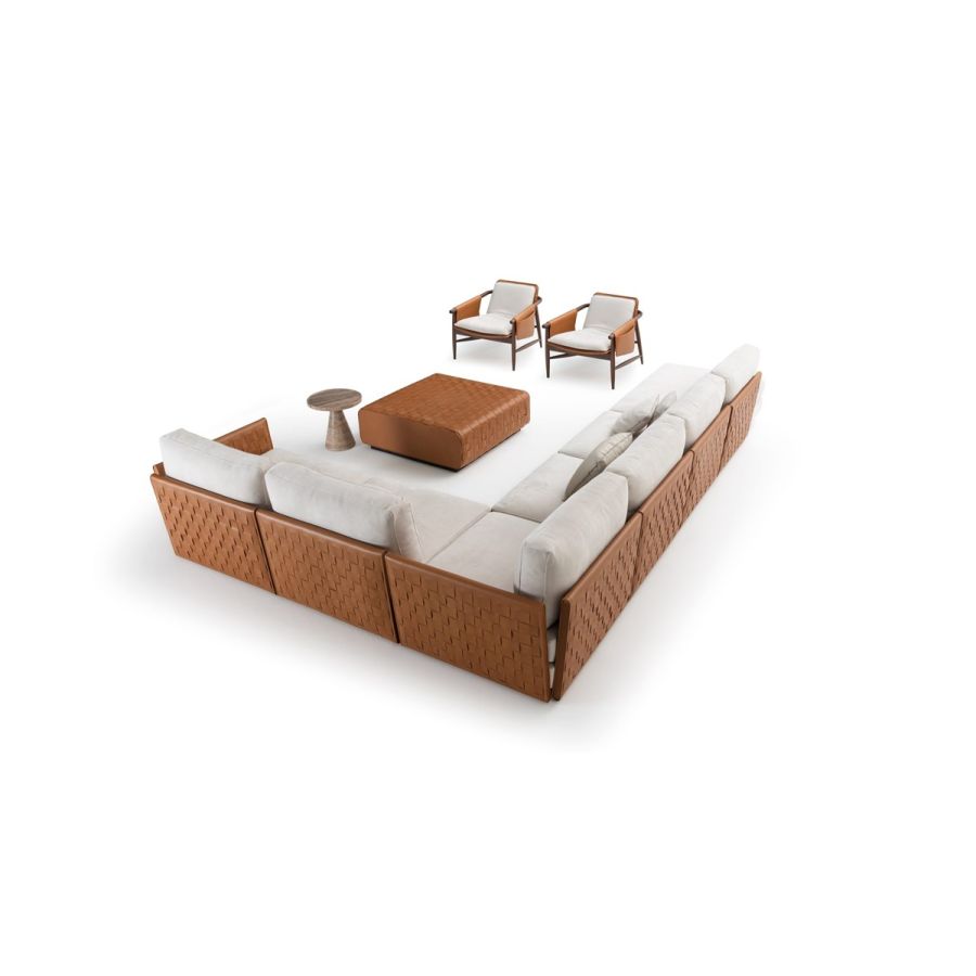 Boogie’s armrests and backrests, are upholstered with wide Tuscan leather strips, intertwined one by one by hand with extraordinary artisan details, which follow the shape of its firm and rounded bearing elements. The rounded volumes of the armrest and backrest make it comfortable at first glance, enriched by unique details that make it inimitable. The Boogie project also comes in its sectional version, thanks to its great flexibility in both dimensions and composition options. The sturdy, yet precious, leather upholstery of its structure blends brilliantly with the softness of its cushions. Moreover, by choosing the type of wood and metal finishes for the armrests and backrests structure, you have all the tools to design an even more unique sofa, perfectly tailored on your taste and preferences. Supported by a leather-covered wooden structure, the solid wood parts stand out with our exclusive finishes and wood options. The Boogie’s armrests are a true masterpiece: hand-woven leather adds a touch of artisanal elegance that enhances the quality and uniqueness of the sofa.