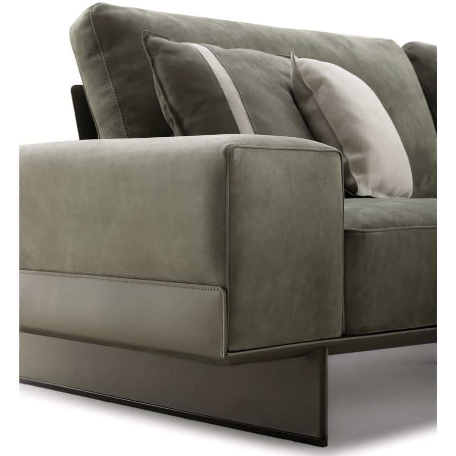 A sofa and a system. The lightness of thoughts and the balanced shapes were created with thin metal sheets covered in leather. Our Granville is designed to create a modularity hovering above the ground in the atmosphere, still maintaining all the same refined and precious elements. These can be produced in two sizes of pillow and sitting, being free to decide the desired composition. It is useful to use wood containers as terminal or central part, combined with drawers to insert pillows, magazines or other objects. At sight-container we have different materials at disposal like the marble or the leather. The comfort of the pillows and the abundant shapes of the armrests make the Granville an elegant, refined and timeless system you can adapt to different spaces and solutions.
