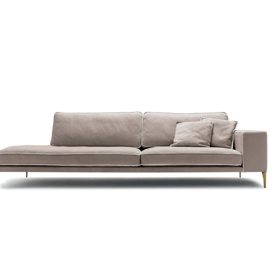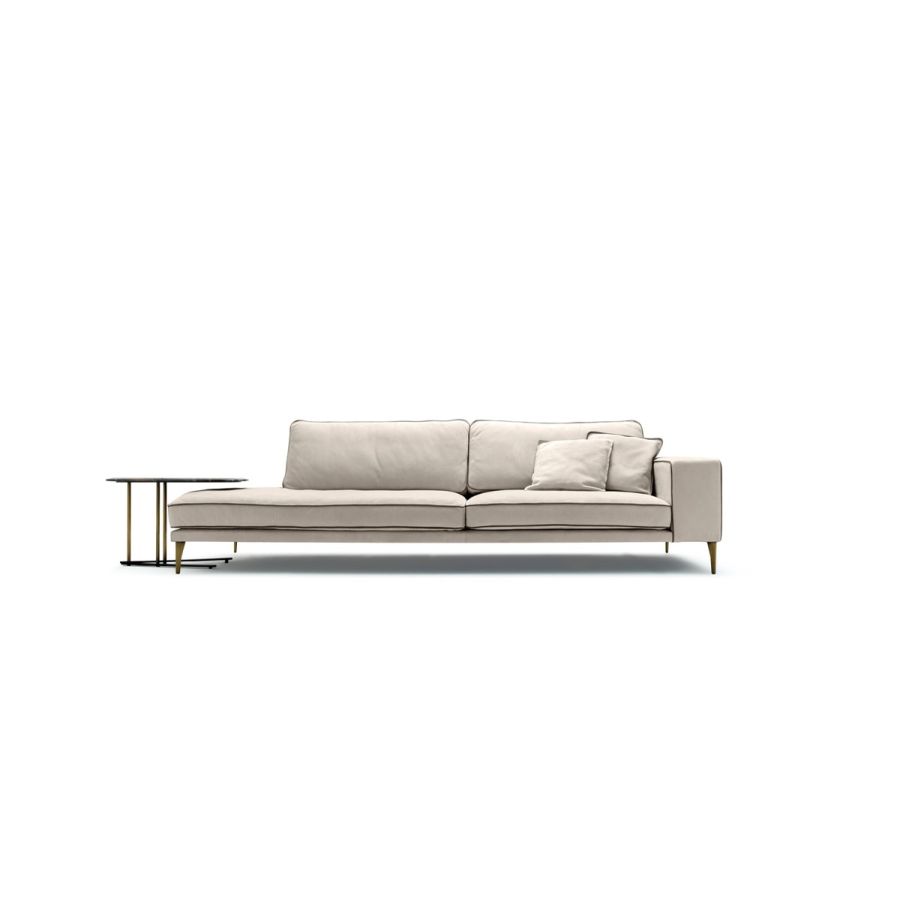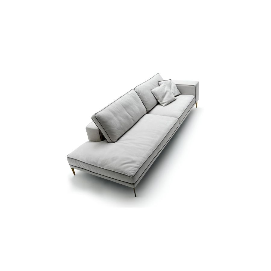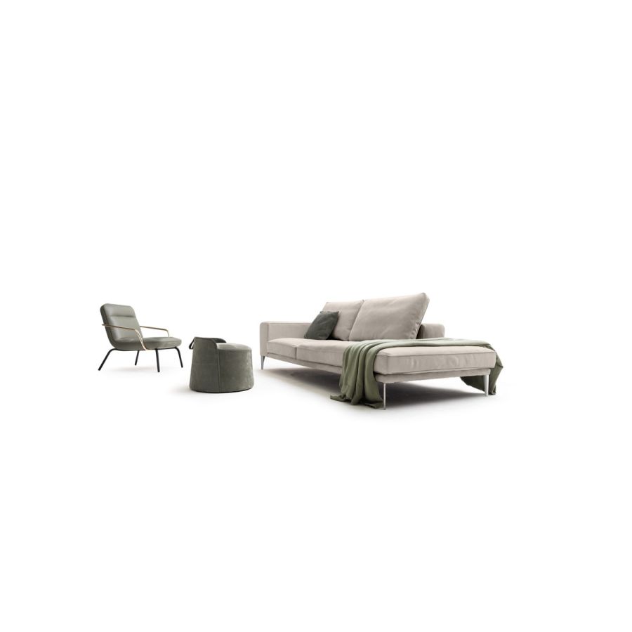A light and essential sofa, with a clean and soft design, which is kept high on the floor by elegant metal feet