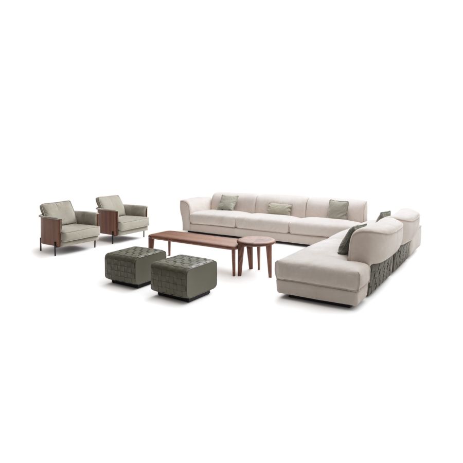 Each configuration is a dialogue between full volumes and airy lines, between elegant proportions and the enveloping comfort of a deep and generous seat. Yet it is the smart modularity that makes it extraordinary: each element connects seamlessly, allowing the client to imagine, change, and evolve.