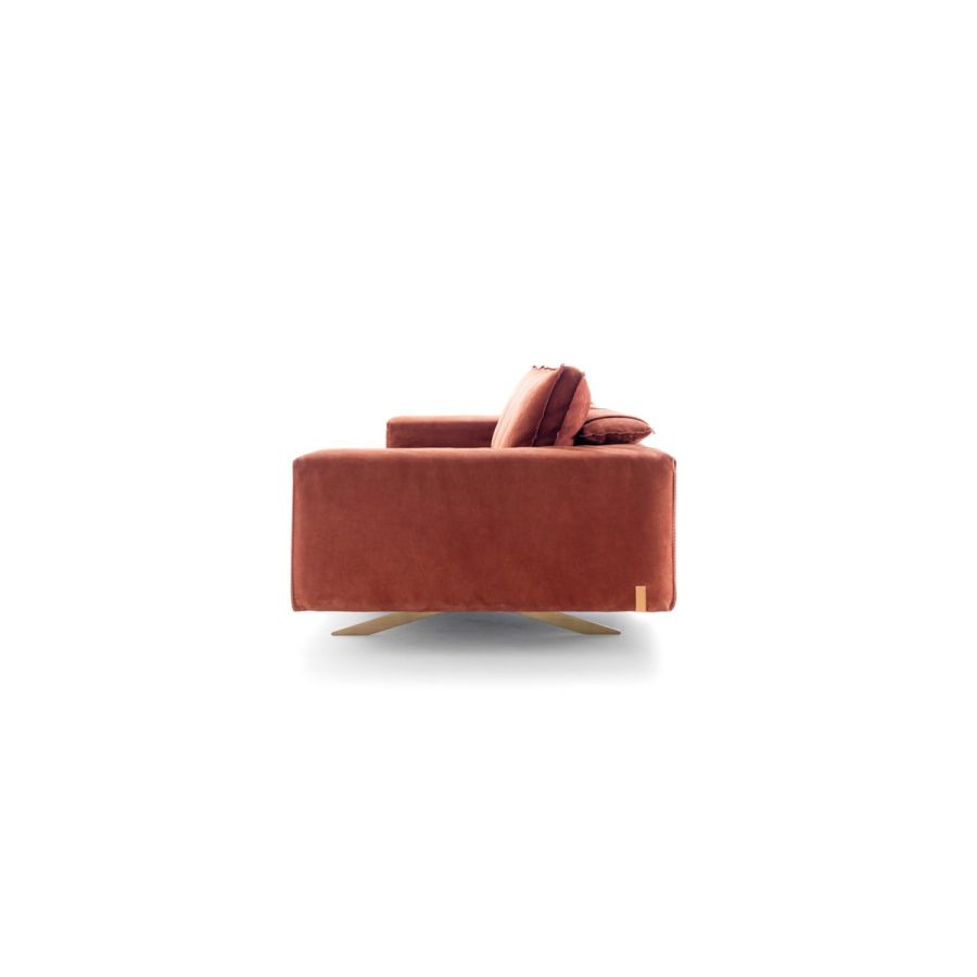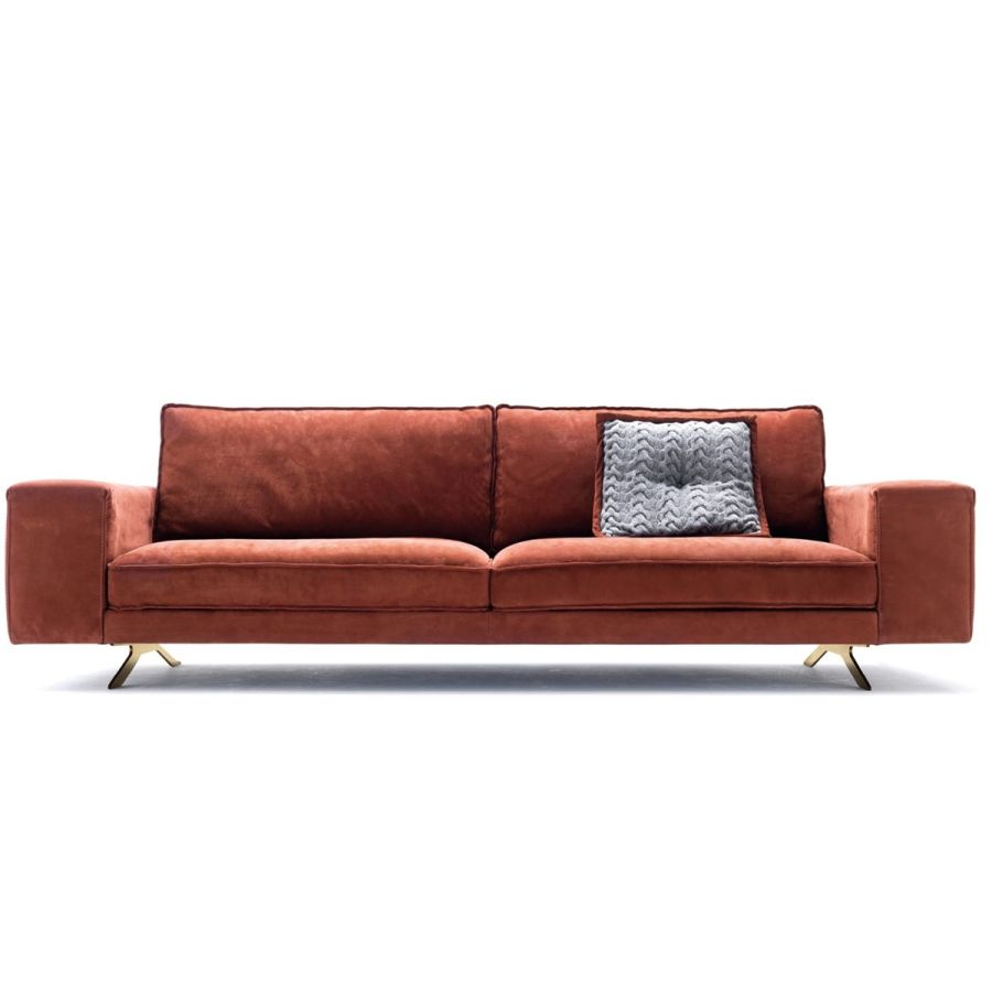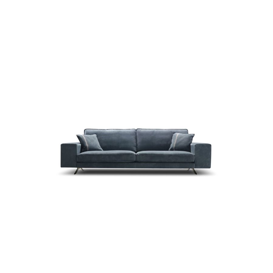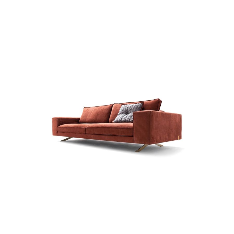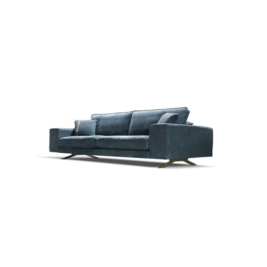 The sofa lays on a metal base with an elegant and light design, available in various finishes.