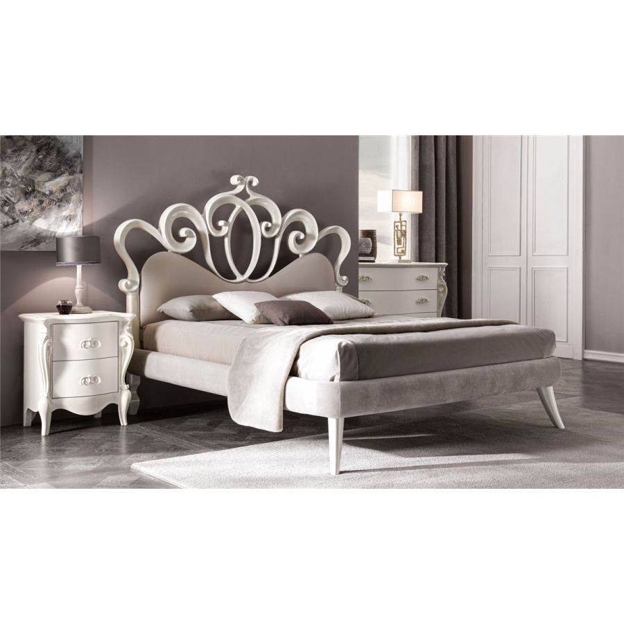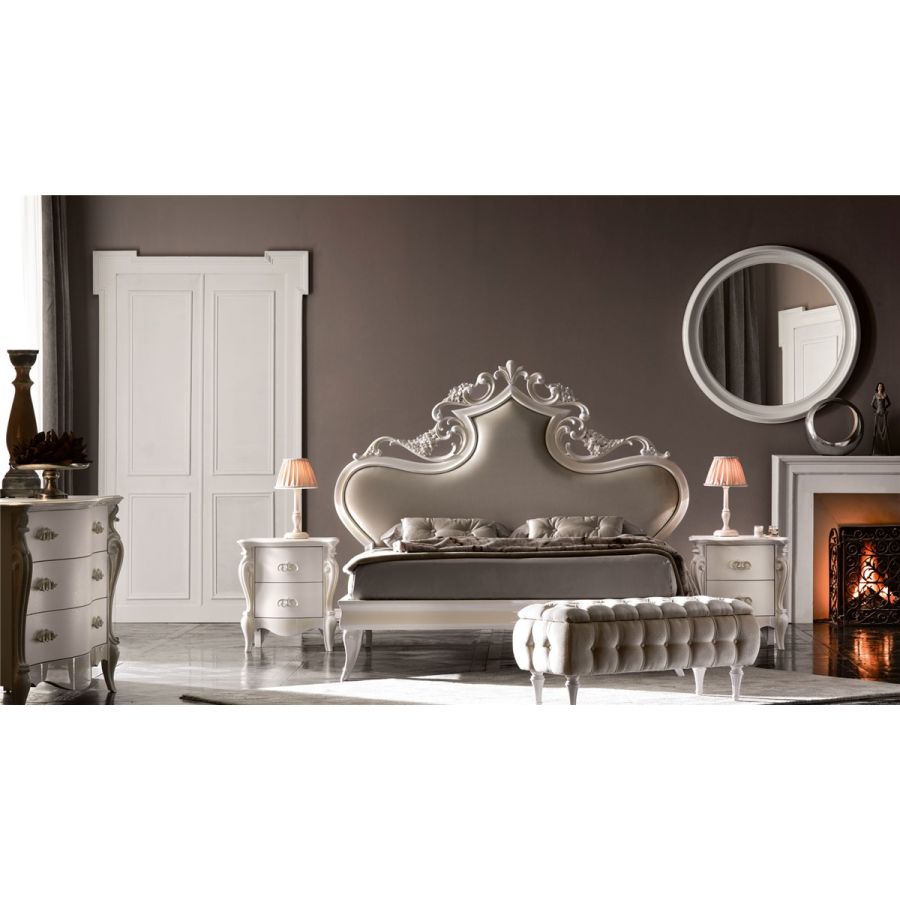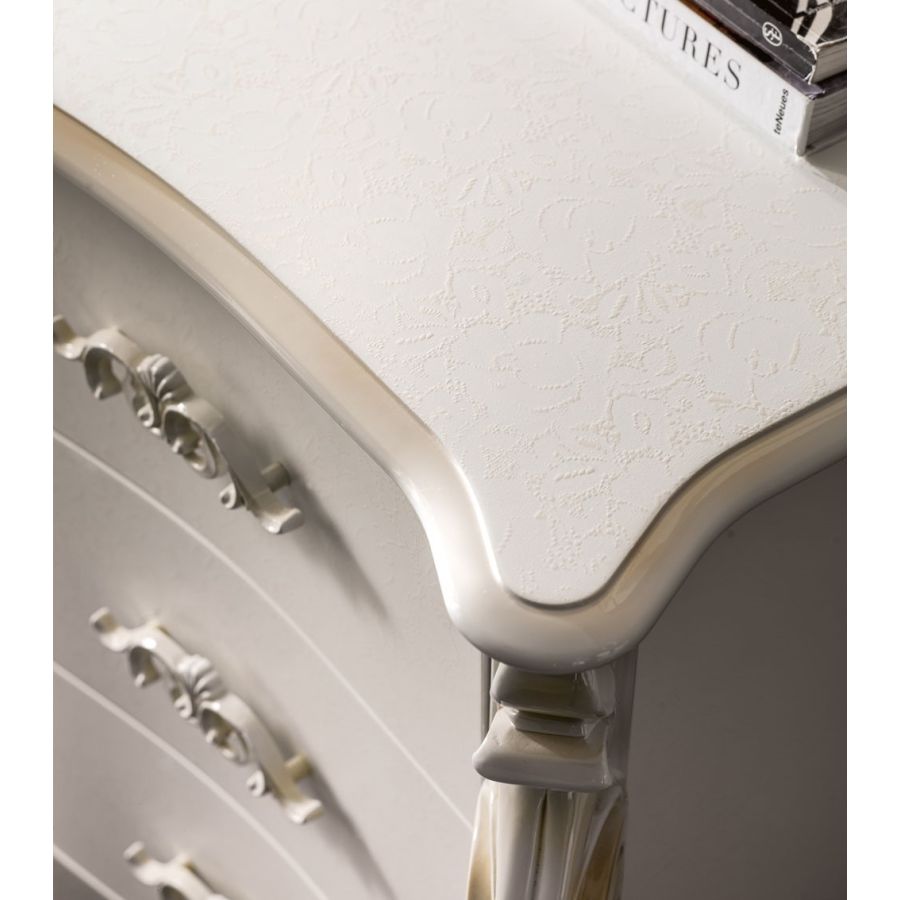 Two-drawer wooden bedside table with generous shapes and large dimensions. The classic and romantic line of the carved legs brings back to the past Renaissance glories. The decorative cast aluminum handles embellish the soft curves of the fronts like gems. . The classic style is made fresh and modern thanks to the wide range of sample decorations, lacquers and brushstrokes. The two-tone game to create with the top and the fronts of the bedside table is refined and elegant.