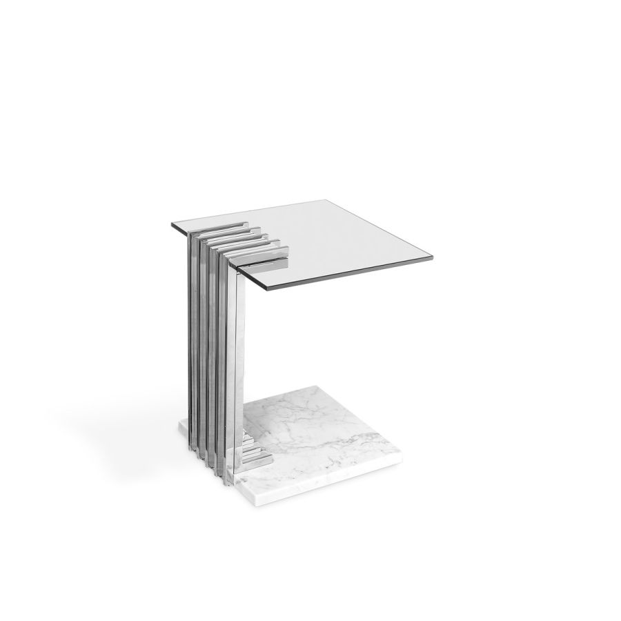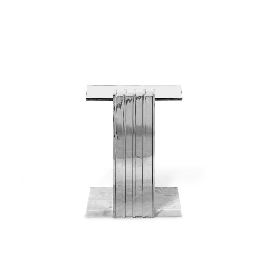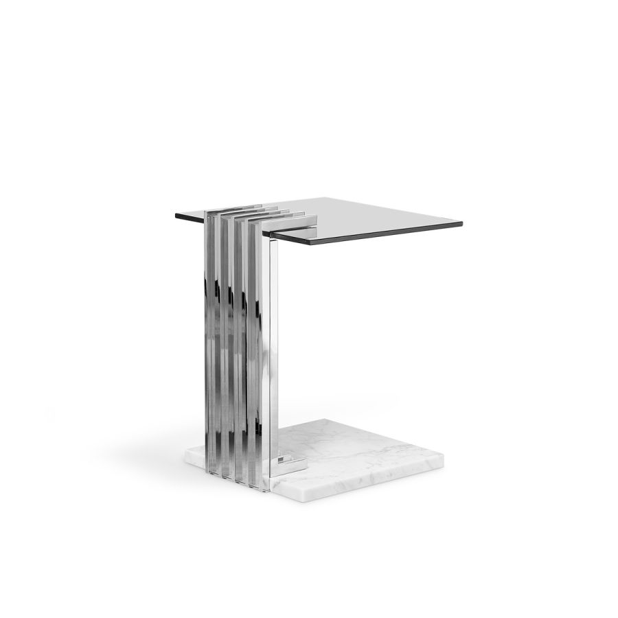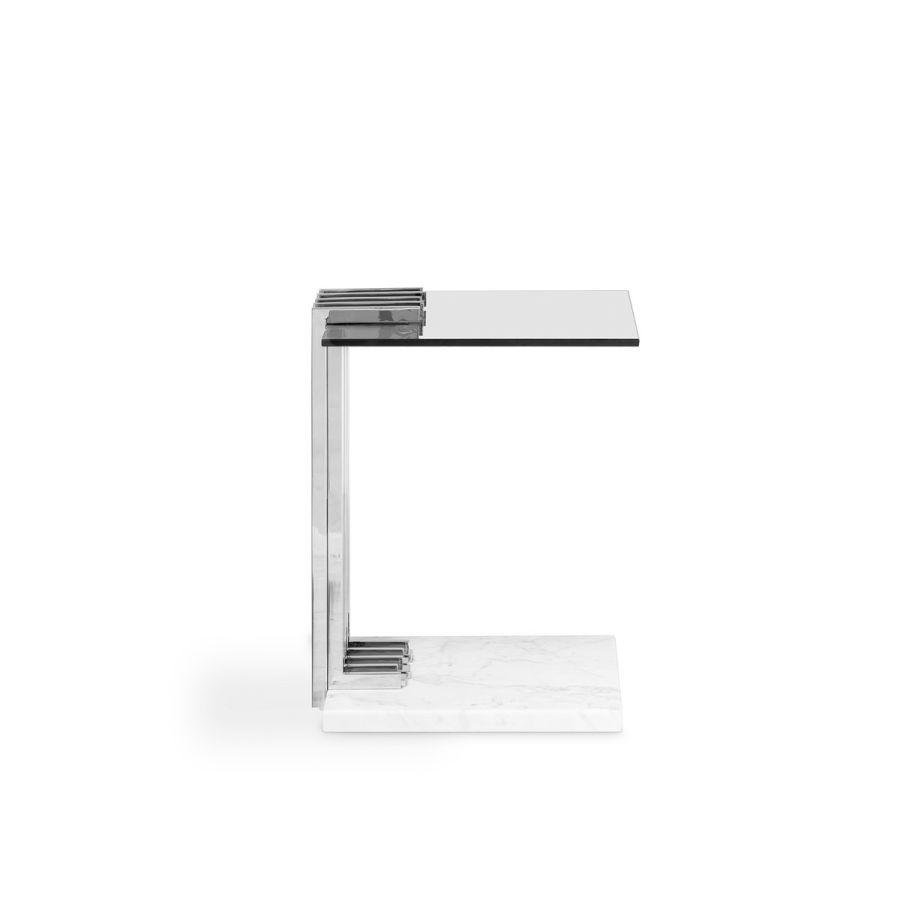 With a sublime shape, this side table is the highest proof of ultimate design. Designed with perfectly crafted marble and stainless steel, this piece creates a unique and sophisticated touch for patio furniture. A fascinating and exclusive outdoor piece that exudes luxury and style. The Vertigo Side Table is the definition of a luxurious outdoor experience.