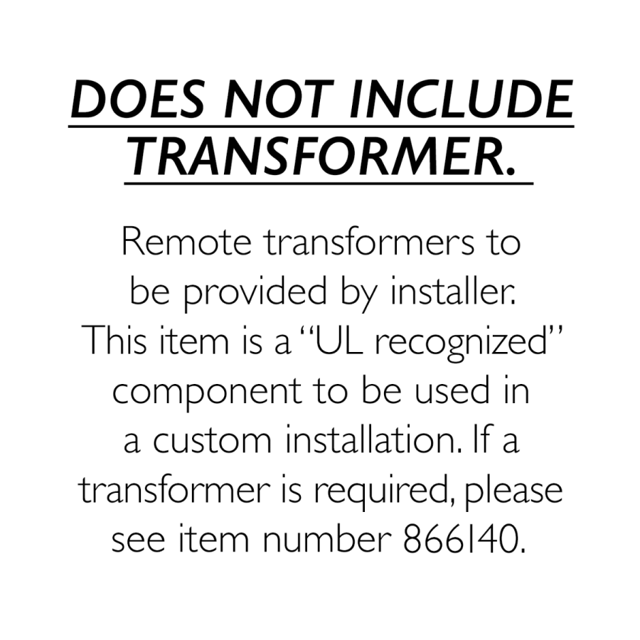 Does not include transformer. Remote transformers to be provided by installer. This item is a “UL recognized” component to be used in a custom installation. For 220V, item is configured with halogen G4 bulb(s).