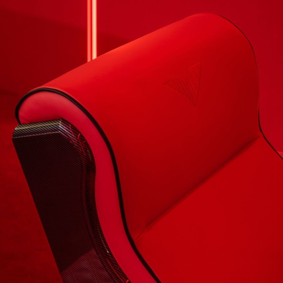 In its Tech version, the Luxor model is proposed with a quilted diamond pattern on the arms, carbon fiber trasfer on the side of the arms and on the back of the seating. On the headrest there is the Vismara V logo embroidered.