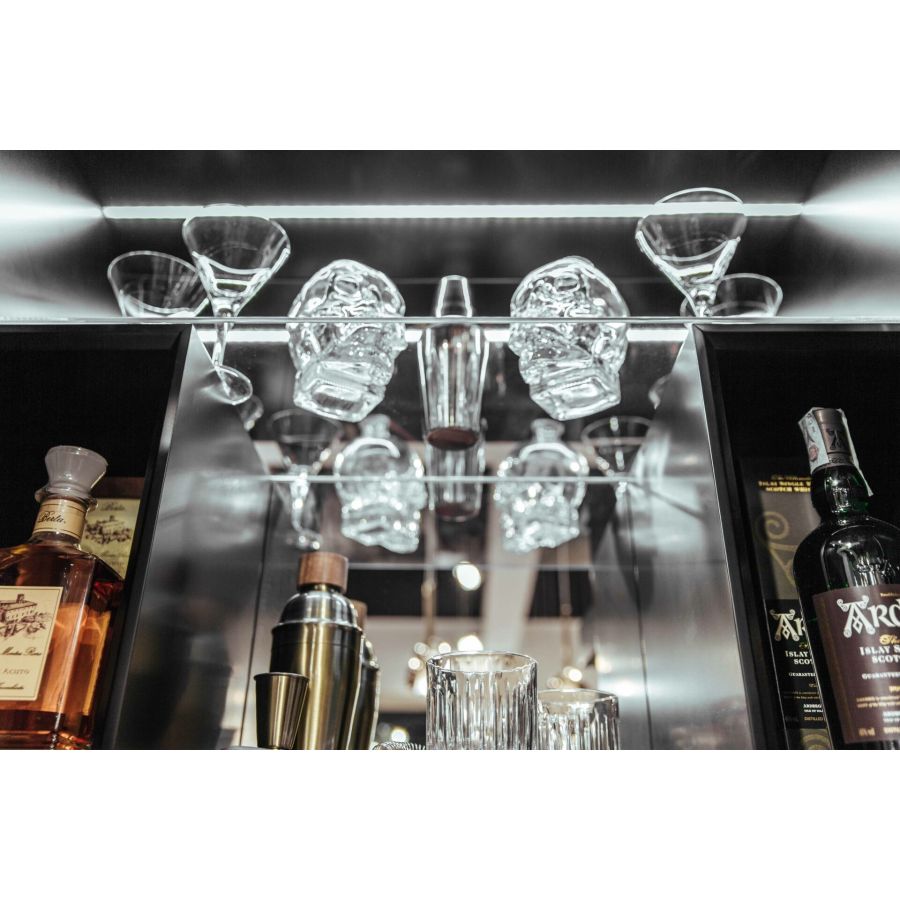 The inner equipment consists of shelves so as to elegantly showcase bottles and glasses, automatic switching lights and a mirror that provides the space with greater depth and brightness.