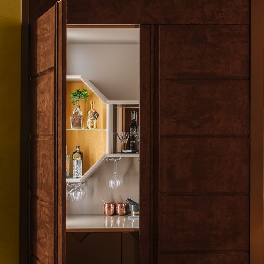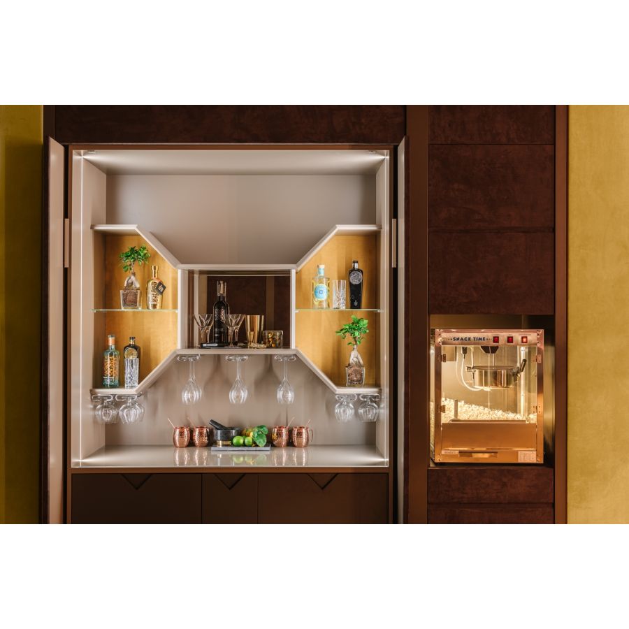 It is a product with an intimate soul, fitted with a special recessed doors system that can cleverly optimize the space while maintaining simple lines and the possibility to conceal everything you may need in a home bar. Once opened, the doors glide sideways to reveal large and well-designed space where to exhibit your finest bottles.