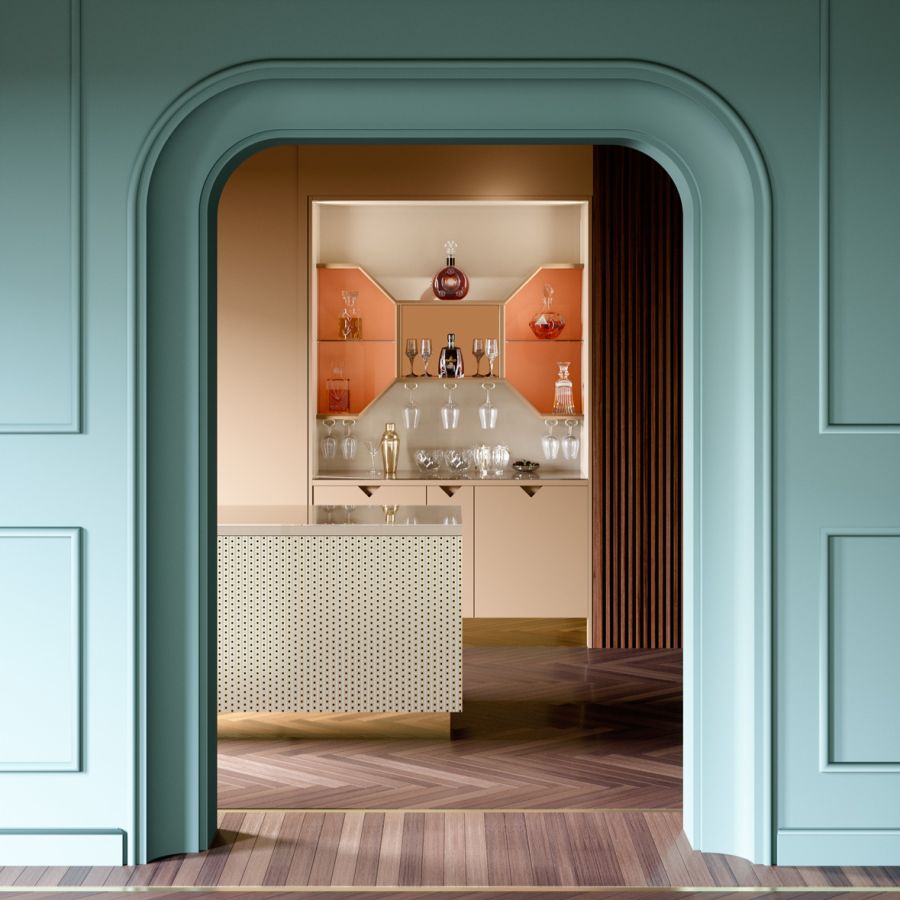 Fellini consists of a spacious working top, equipped door compartments to host small appliances and drawers. In the upper part, open shelves create an essential layout, where to display bottles and store stem glass in specific stainless steel holders. Recessed led stripes and a mirrored back, light up the entire piece, creating an exclusive and sought-after