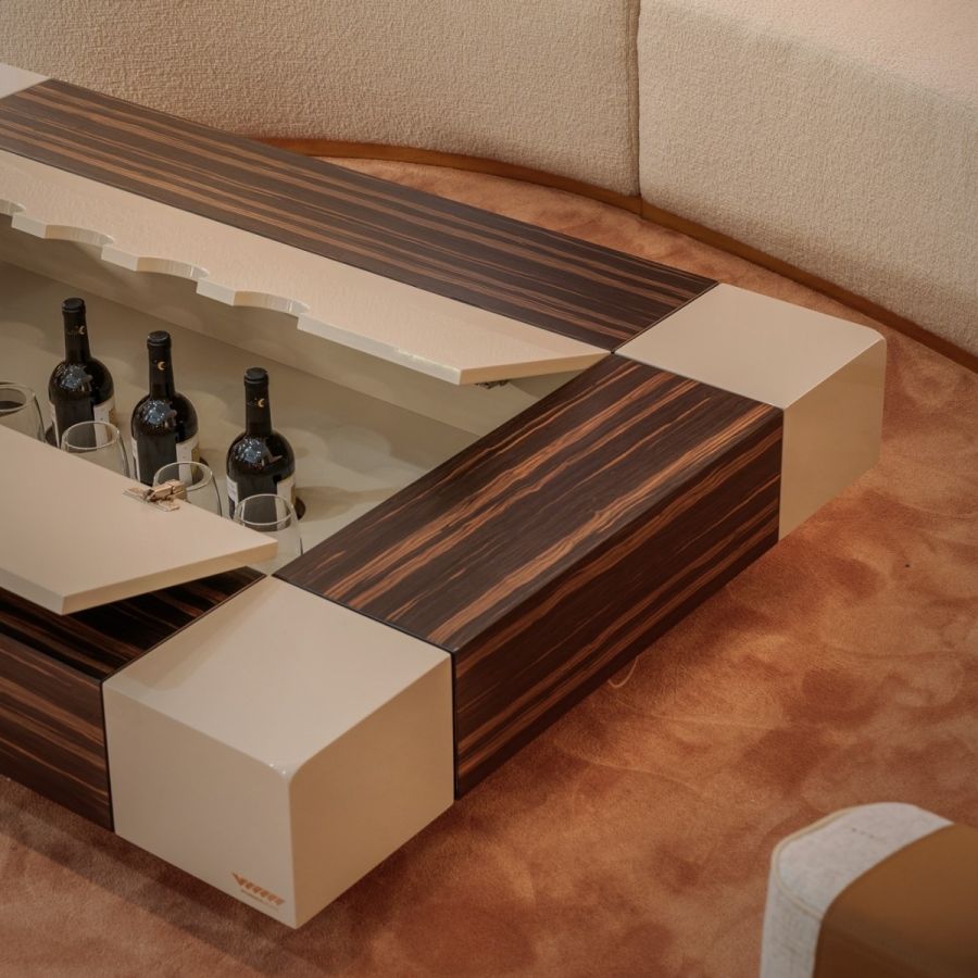 Ciaika is a coffee table that hides compartments for storing various objects and bottles.