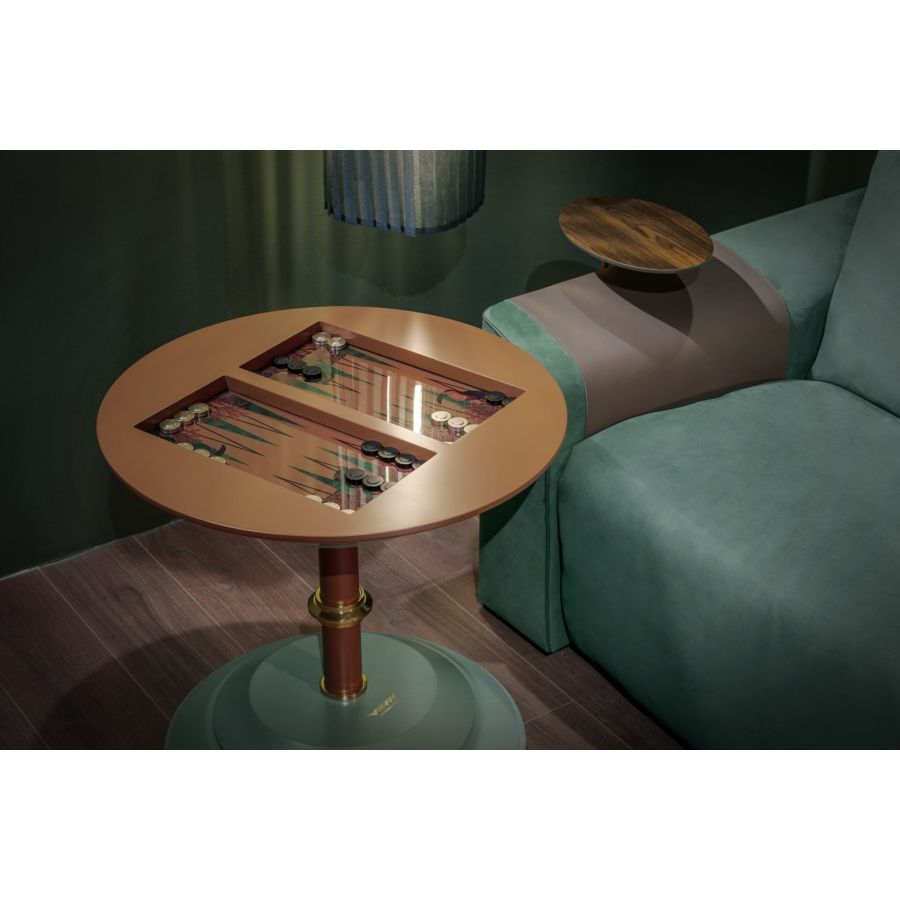 Being a high table, it is perfect for enriching bar areas. Goemon is also available in a low version, to be used as coffee table. In this edition the table can be provided with an additional chess top to be placed on the backgammon board.