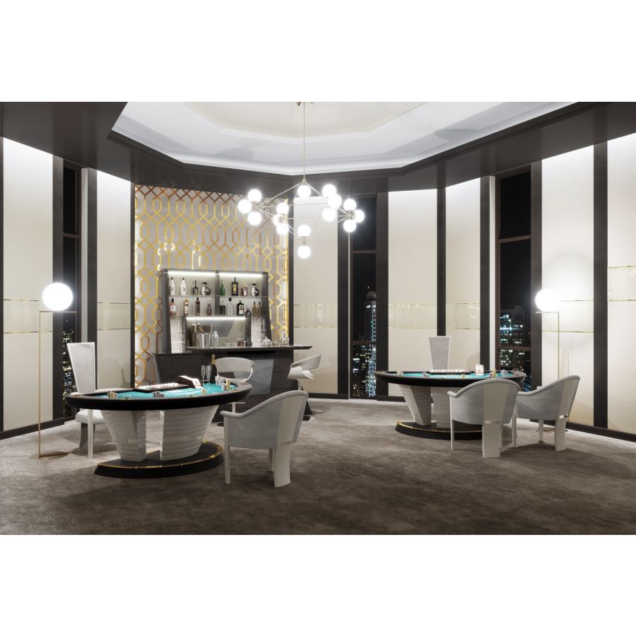 Napoleon is a table for the fascinating Blackjack game. Designed through an original style and a captivating aesthetic. The entire wooden structure is adorned with sophisticated stainless steel inserts, and the cloth is customizable both in color and in layout.