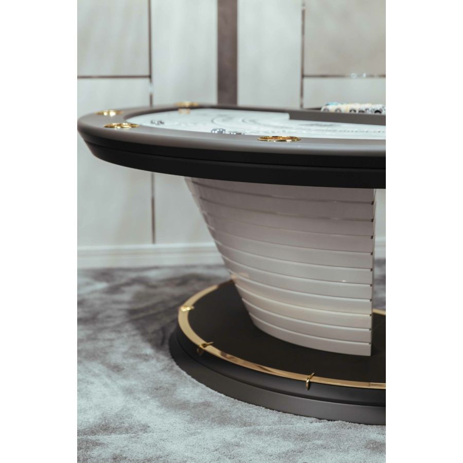 All these elements are harmoniously combined in order to create a furniture endowed with great beauty and flawless functionality. The table includes 6 built-in steel cup holders on the top rails and a lacquered chips tray for the dealer.