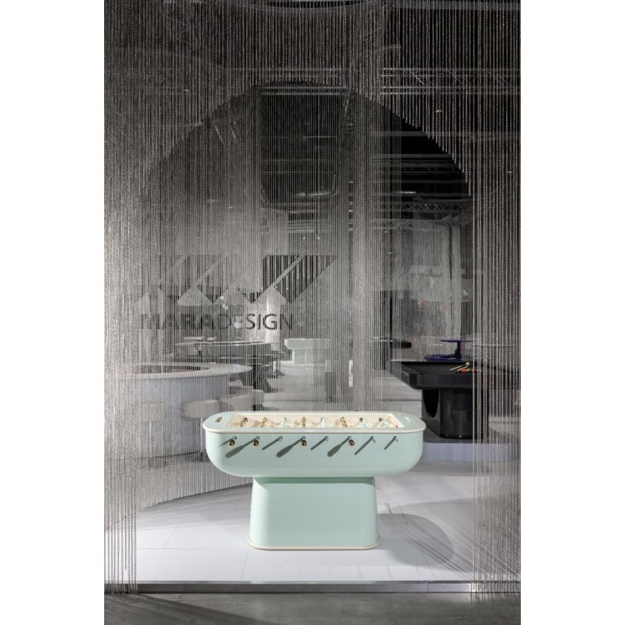 Oskar Foosball Table is proposed in glossy lacquering to enanche its shape. The playing field is in back lacquered tempered glass. The players are in steel, available in 4 finishes or even lacquered.