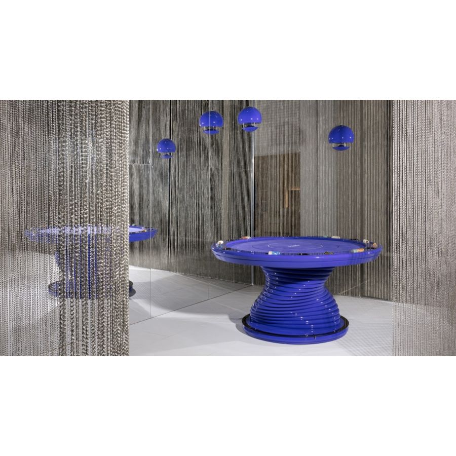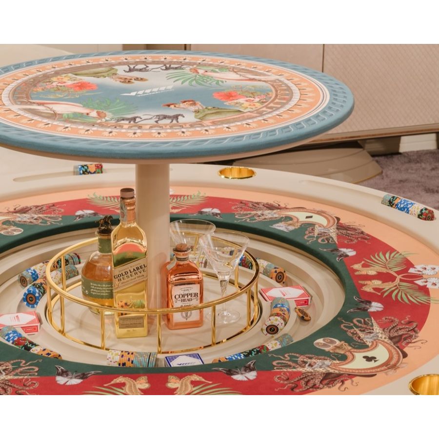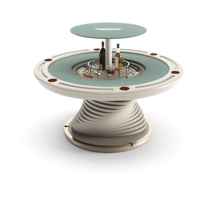 Mirabilia, a round poker table, is a unique piece equipped with a pop-up mechanism that reveals a bar element inside.