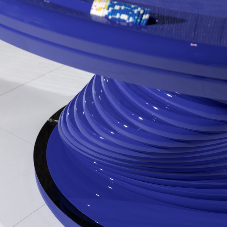 The base of the table is a contemporary design element: helicoidal shape created with the overlap of several rings in lacquered wood. The table also has steel cup holders built-in the top and built-in chips holders.