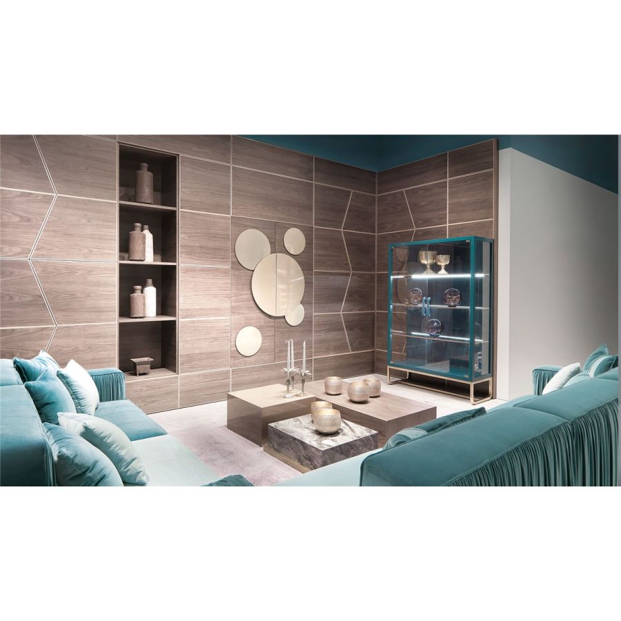 A charming and classy collection, with an international feature, classic in details an modern in the shape. A refined and elegant furnishing product, with gentle but effective chromatic and material contrasts. The back of the showcase is embellished by the elegant groove characteristic of the whole collection. The wooden structure that can be decorated in a wide range of finishes is well highlighted by the transparency of the doors and shelves in extra-clear glass. The gentle interior lighting will perfect any environment with a warm and relaxing atmosphere.