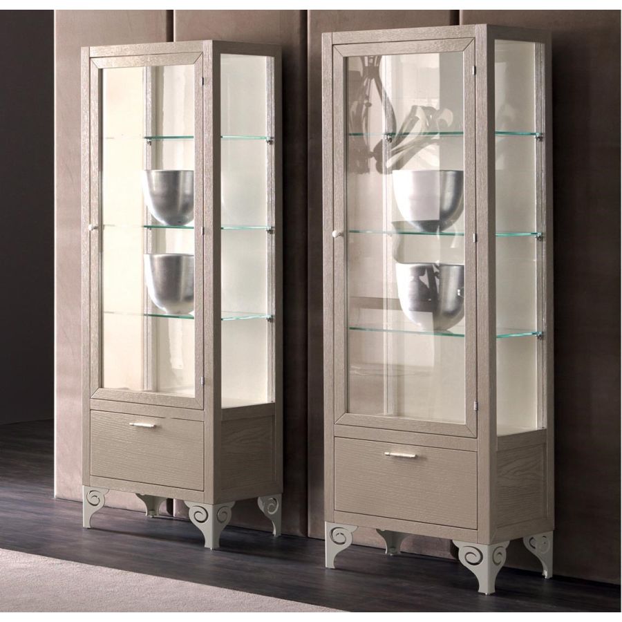 Structure in blockboard of poplar and solid veneered MDF or veneered 10/10 brushed planks. Tempered glass door with solid wood frame. Glass shelves 8 mm thick. Birch plywood drawer with blumotion metal guides