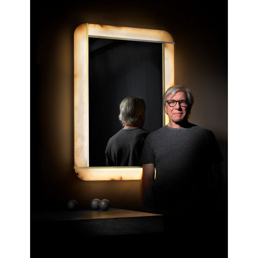 Rectangular mirror framed with illuminated hand-cut alabaster that emits a warm ambient light. Available in two sizes. Designed by Doyle Crosby. There will be some variation in the color and veining of alabaster.