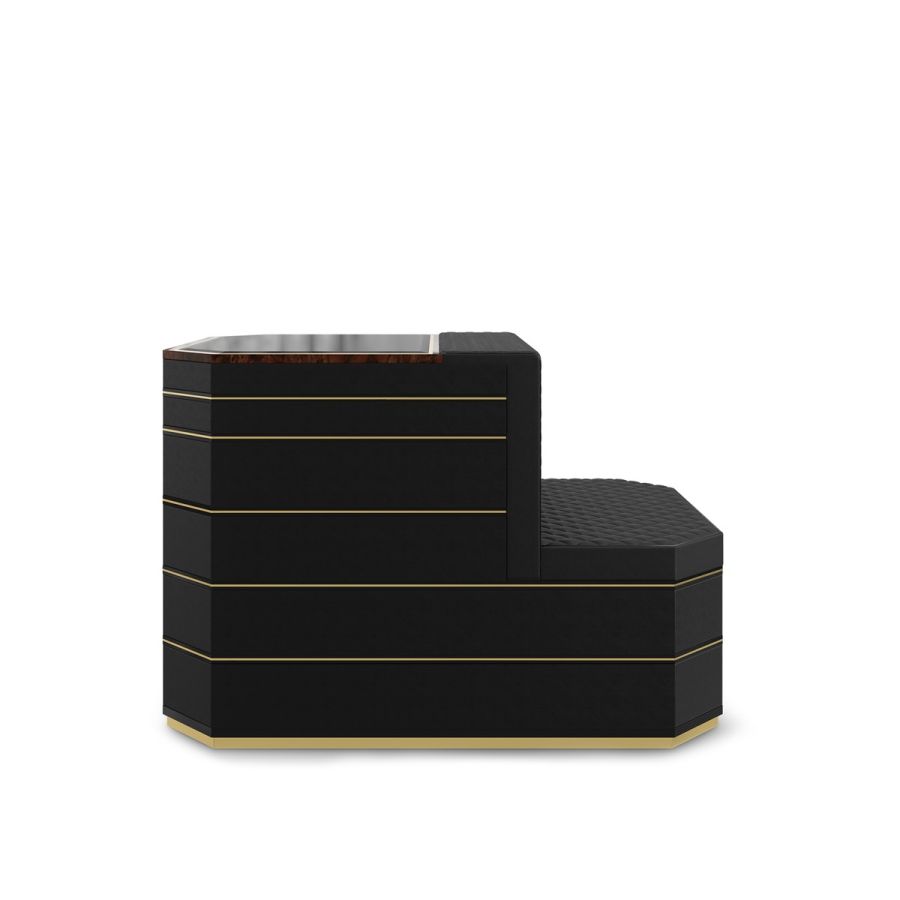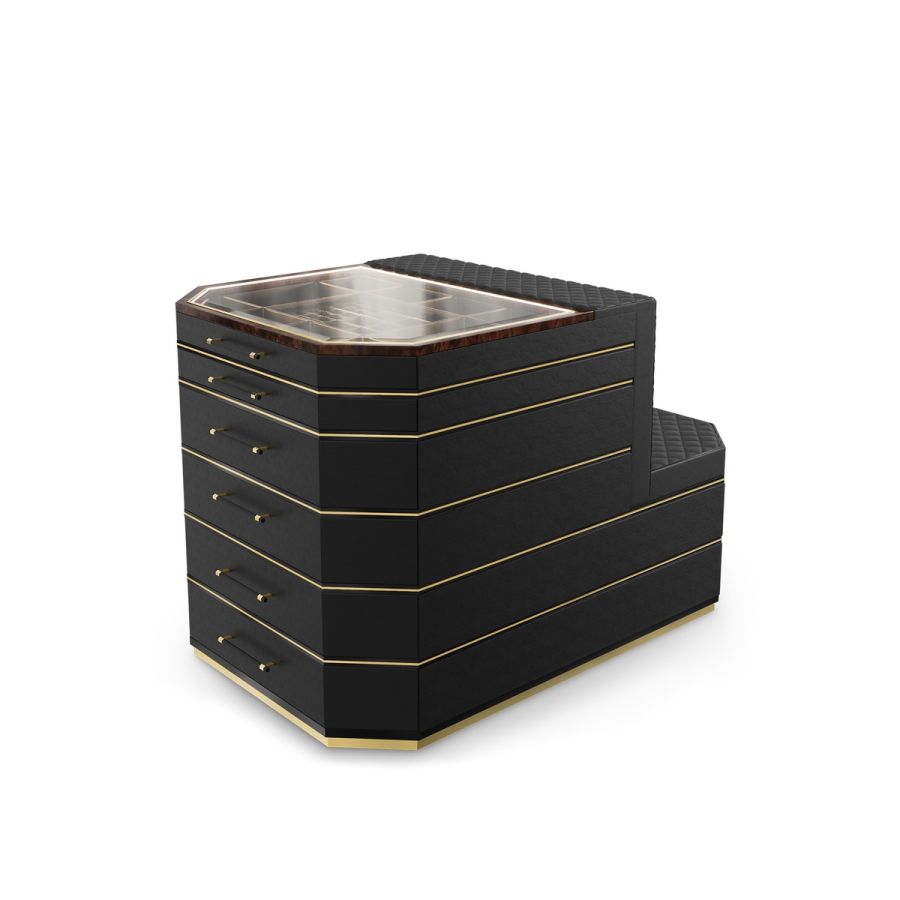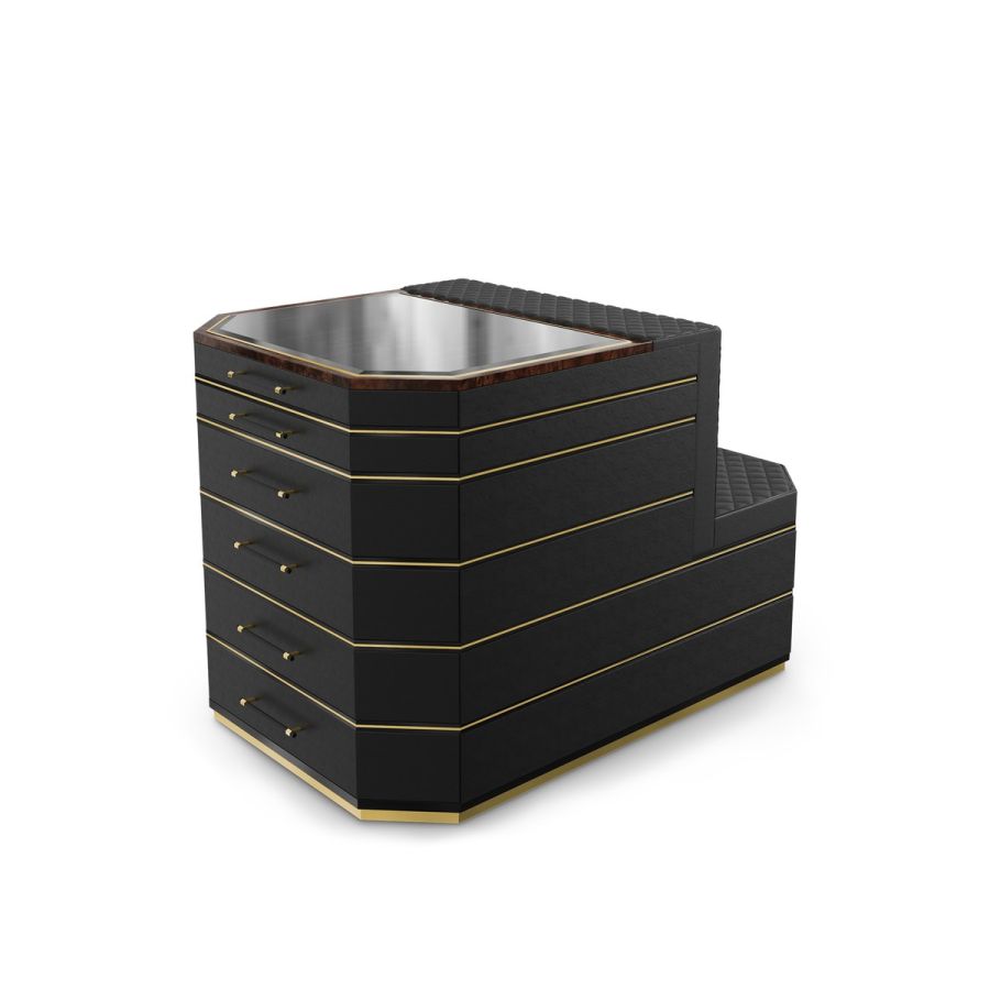 The Waltz Closet Island is bound to become the center of attention with its sleek look. Waltz features a glimmering black exterior enhanced with lacquer and walnut root. It is also tufted with leather, and it has a glass top that acts as a perfect display for one's jewelry and accessories. Horizontal polished brass lines offer a more detailed character to this closet island.