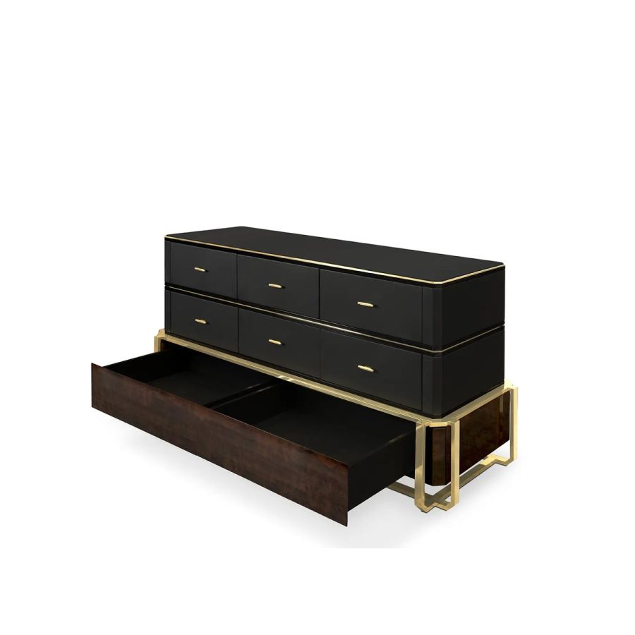 The Waltz Dresser transcends the ordinary, offering a premium and versatile storage solution. With its eight spacious drawers adorned with exquisite brass hardware, this elegant dresser is perfect for a luxury master bedroom or wardrobe. Meticulously crafted from the finest materials and finished with the utmost attention to detail, it exudes luxury and sophistication.