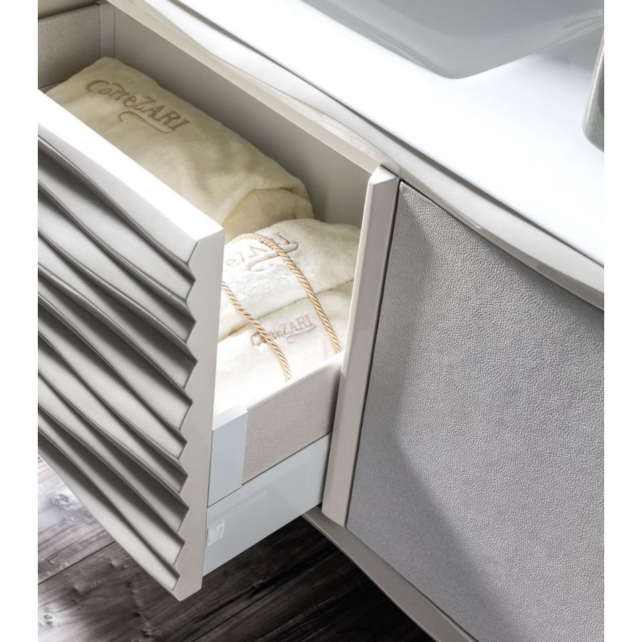 Modern-zeitgenössische Kommode und Nachttisch, realisiert mit einem edlen, aus Holz geschnitzten Wellendesign und integrierter Glasplatte. Ebon ist ein isoliertes Atoll im Ozean, das wie die Oberfläche dieser Kollektion mit wellenförmigen Sandstränden übersät ist: eine perfekte Balance aus Technik und Schönheit. Reine Formen, perfekte Linien, vorbildliche „Gegenstände“, die für unser tägliches Leben nützlich, aber auch notwendig sind, um unser Leben schön zu machen. Die Produkte der Ebon-Linie sind die ideale Lösung für ein elegantes, luxuriöses und originelles Badezimmer.