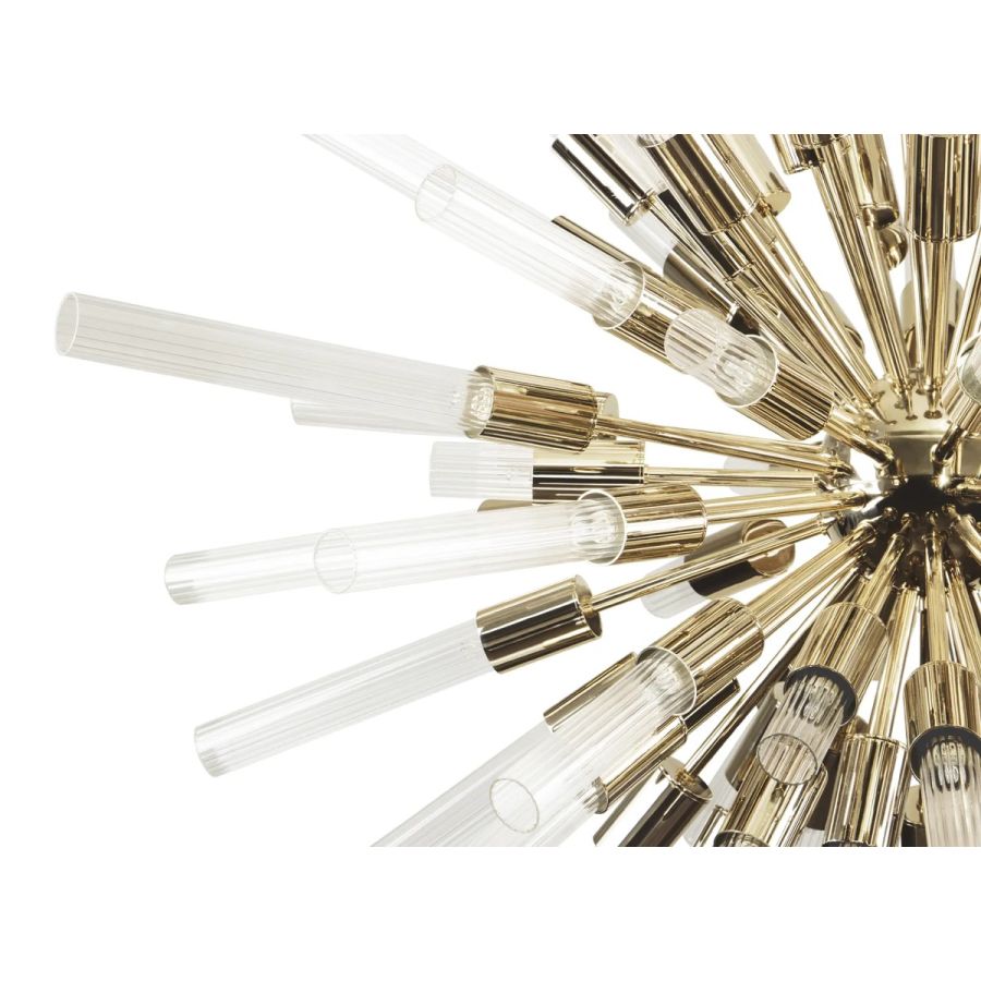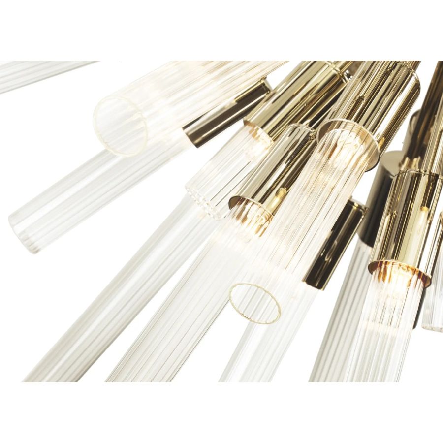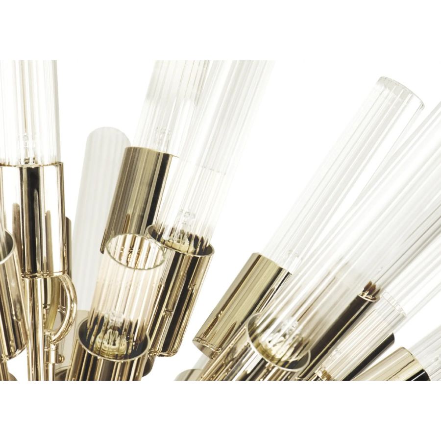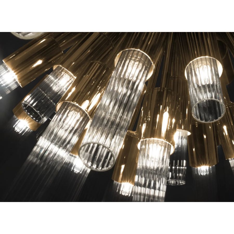 Preserving the inspiration of the natural sensation of waterfalls, this unique piece was born to complete the superb Waterfall Collection. Made with high-quality brass and beautifully handmade ribbed tubes of crystal glass, this powerful creation will fit perfectly into any ambiance.