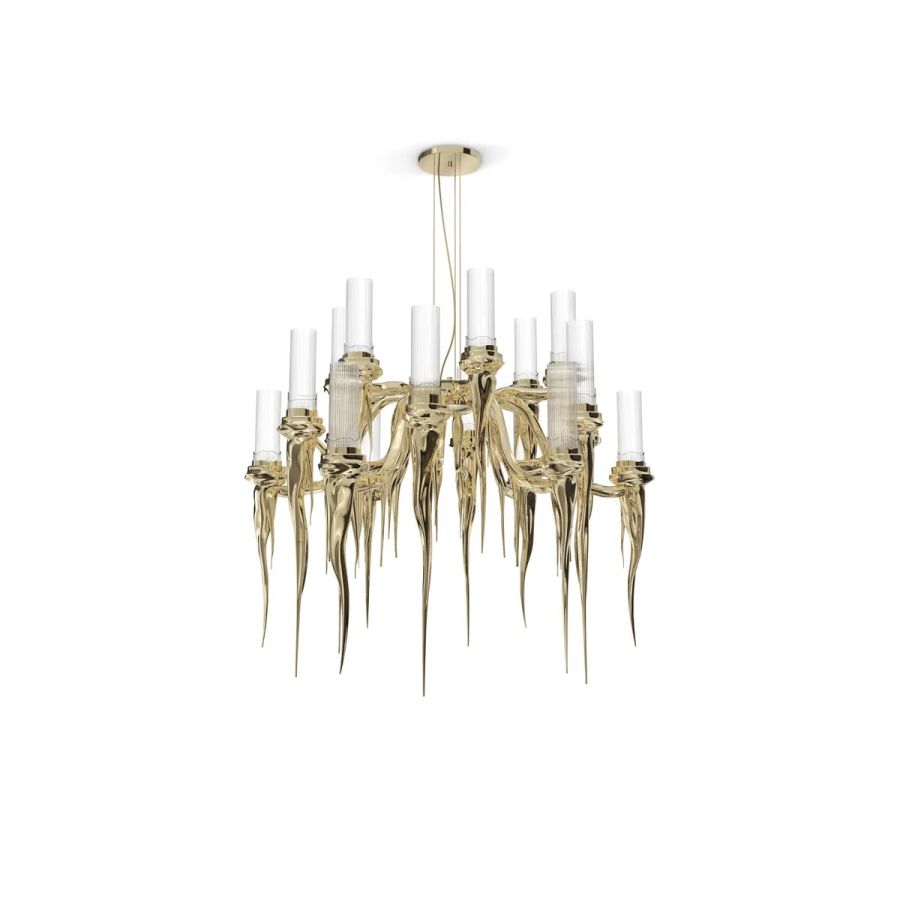 The Wax Chandelier brings a timeless sense of luxury, blending the elegance of classical design with the refinement of modern craftsmanship. Crafted from gold-plated brass and adorned with flowing tubes of handmade crystal glass, its distinctive silhouette evokes the gentle movement of wax in motion — soft, luminous, and utterly captivating. A perfect statement piece for contemporary interiors with a touch of old-world charm.