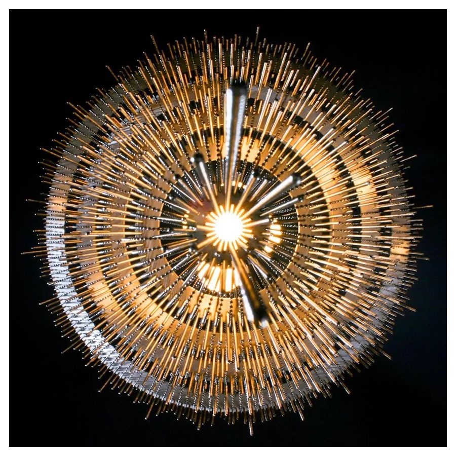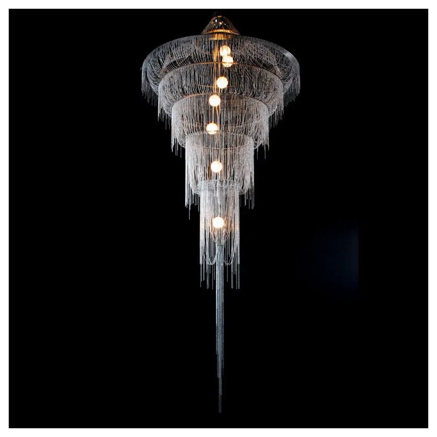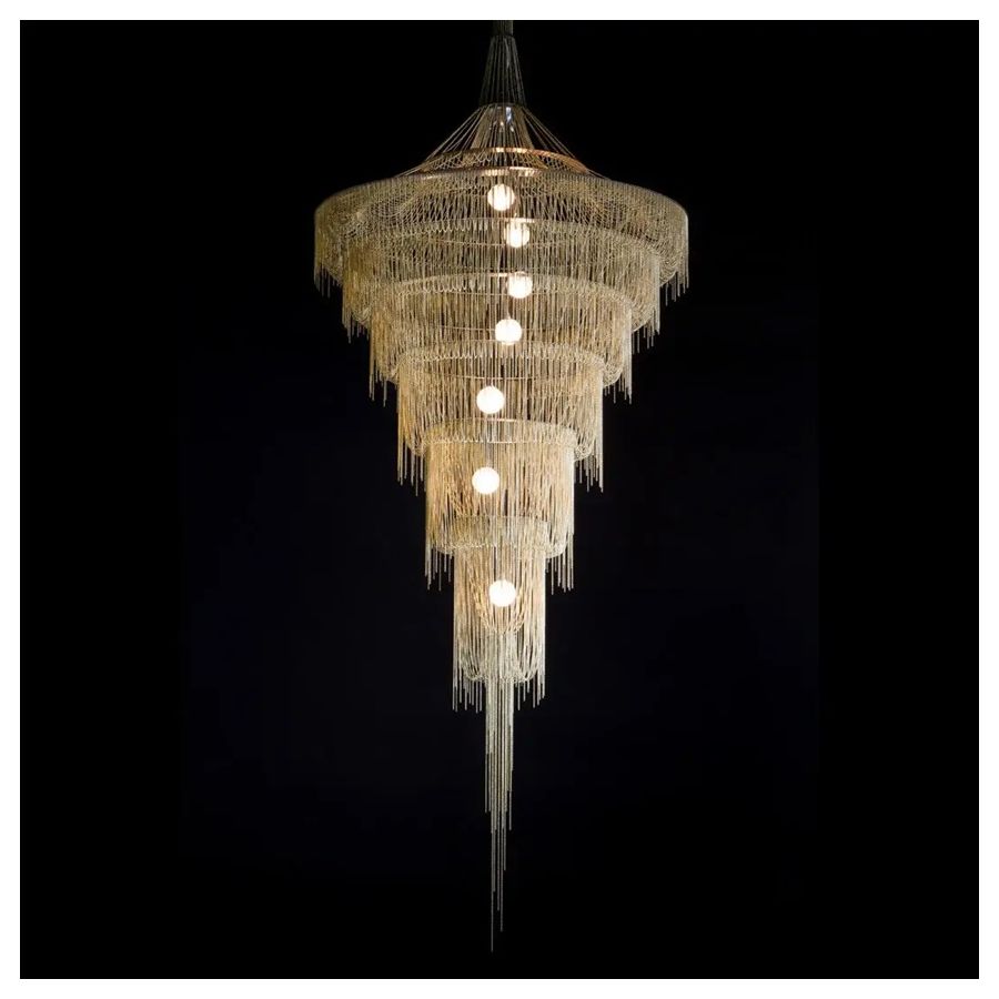 Several cascading rings of stainless steel frames. Illuminated by 7 G9 Halogen or LED lamps in 7 suspended pyrex glass balls in a spiraling formation.