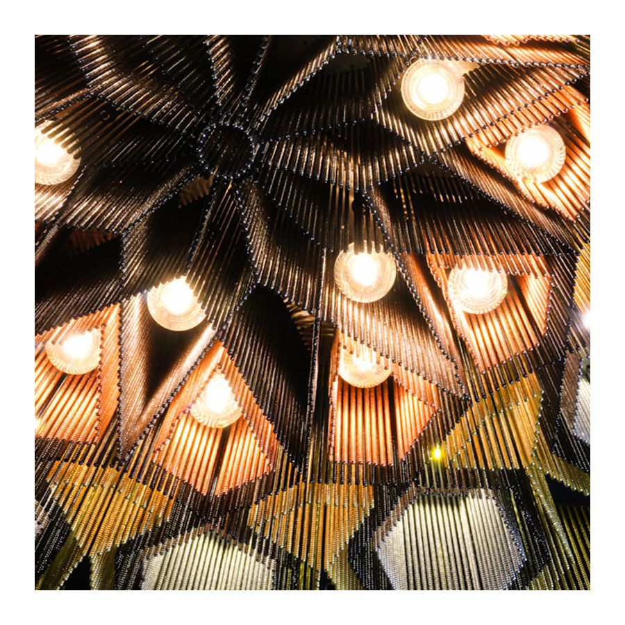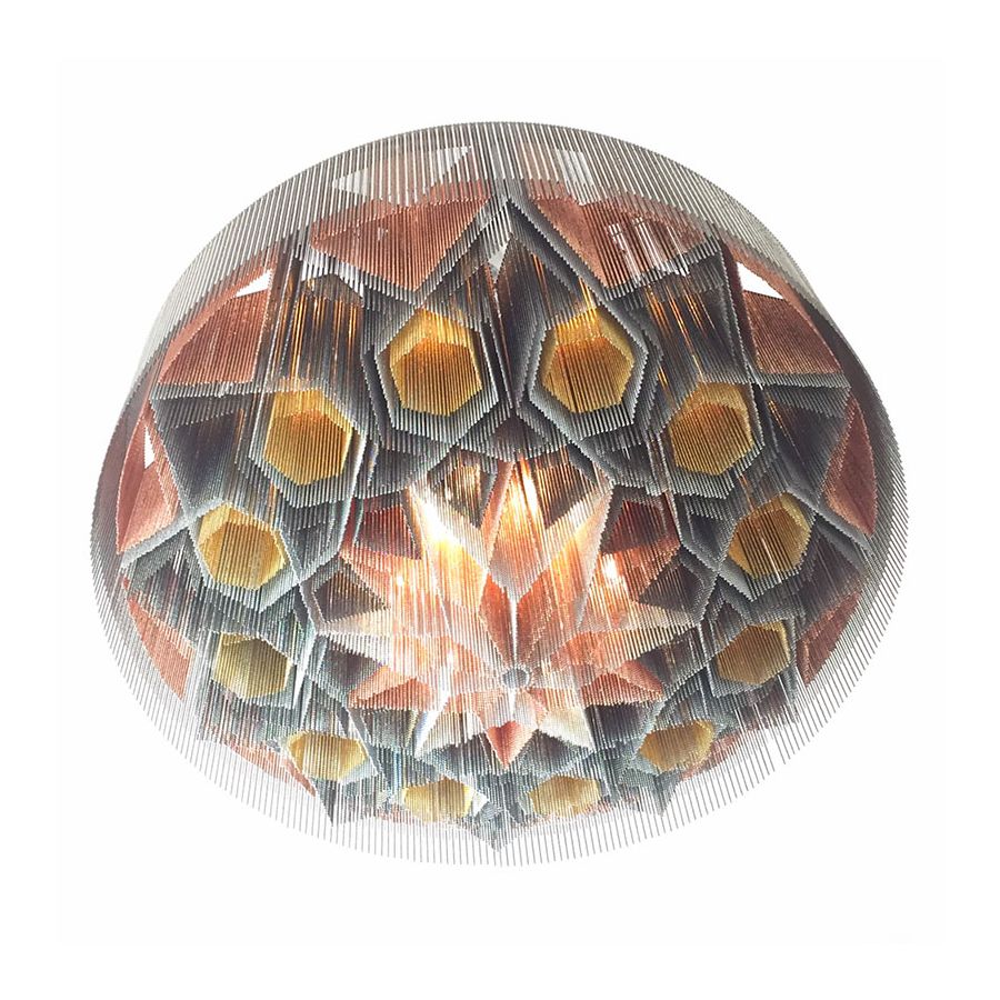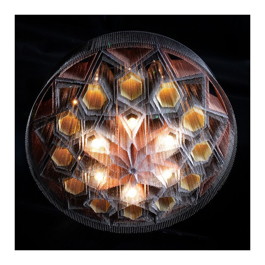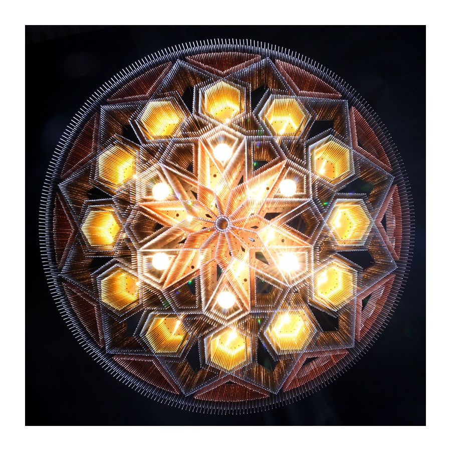 The ceiling mounted version of a massive intense Illuminated Mandala sculpture inspired by Islamic patterns which have been translated into three dimensions through the extrusion of the complex interlocking geometry. Illuminated by a combination of surface mounted and suspended G4 Halogen or LED lamps. Mandala No.2 is a `shallower` version than Mandala No.1 with a more evident pattern from any angle.
