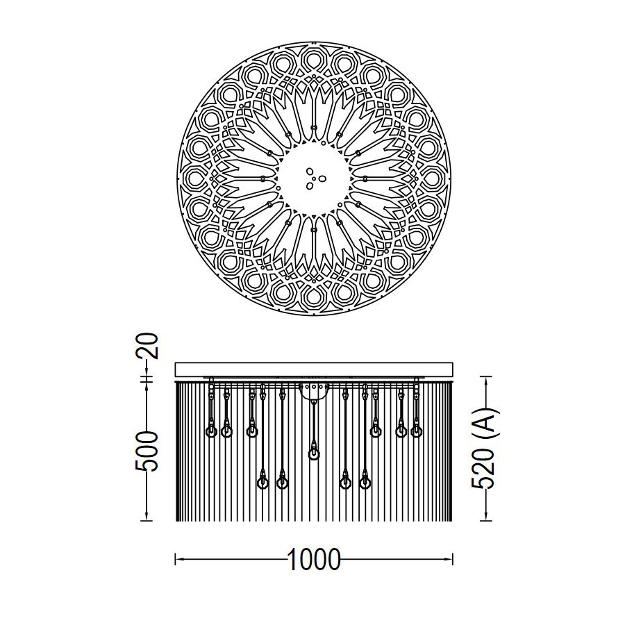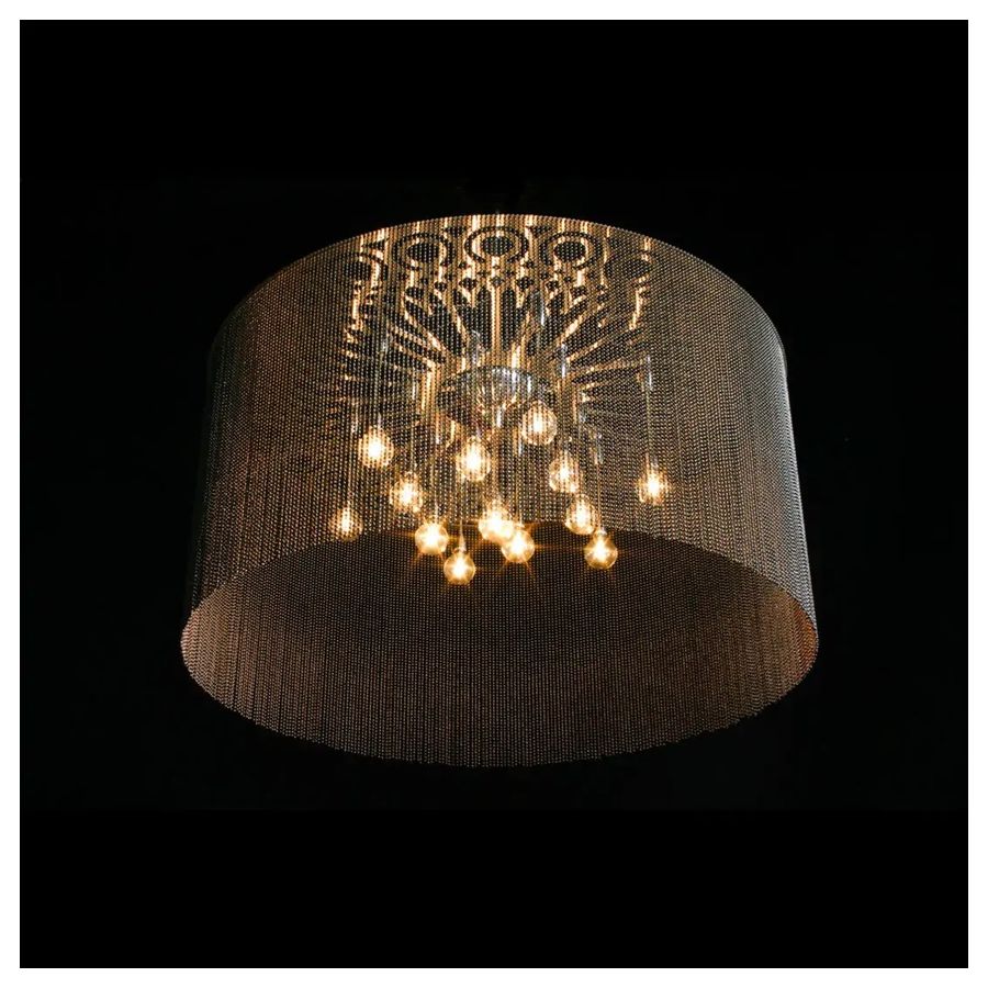 A ceiling mounted circular drum shaped chandelier inspired by Venetian wrought ironwork. Illuminated by a suspended arrangement of 19 pyrex glass balls containing G4 Halogen or LED lamps.