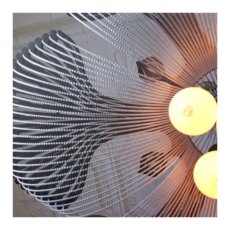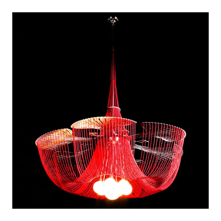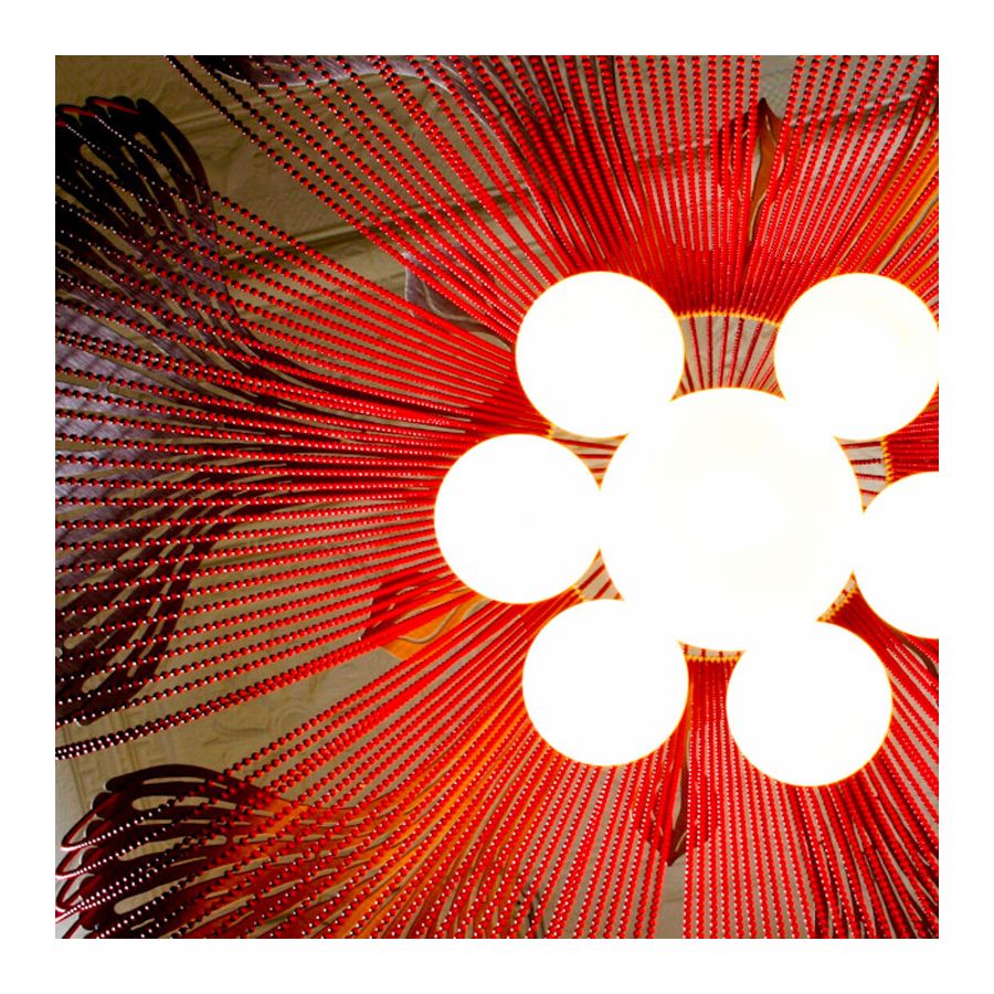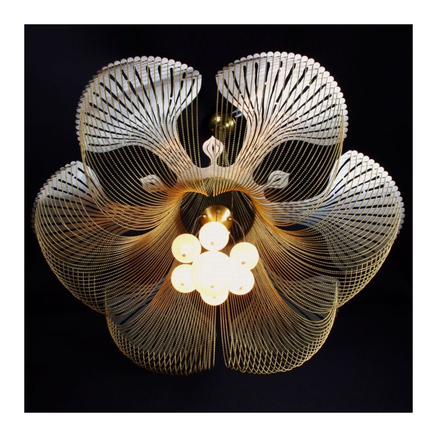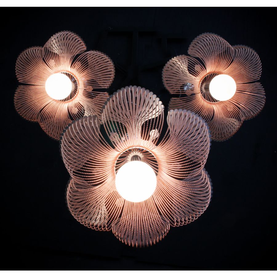 A chandelier design based on the form of Moonflower. Illuminated by suspended cluster arrangement of 7 pyrex glass balls containing G9-Halogen or LED lamps.