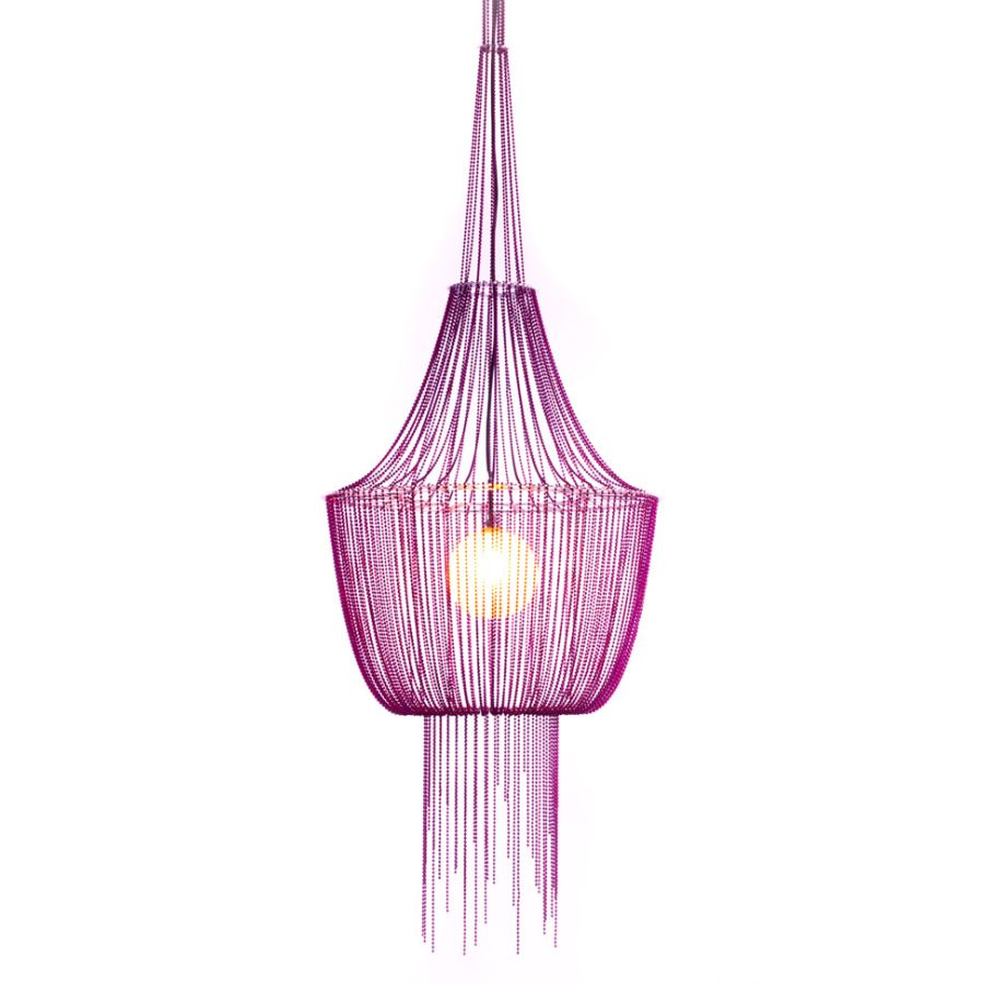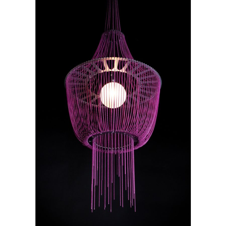 A small `chinease lantern` like miniture chandelier pendant lamp. Illuminated by a pyrex glass ball containing a G9-Halogen or LED lamp.